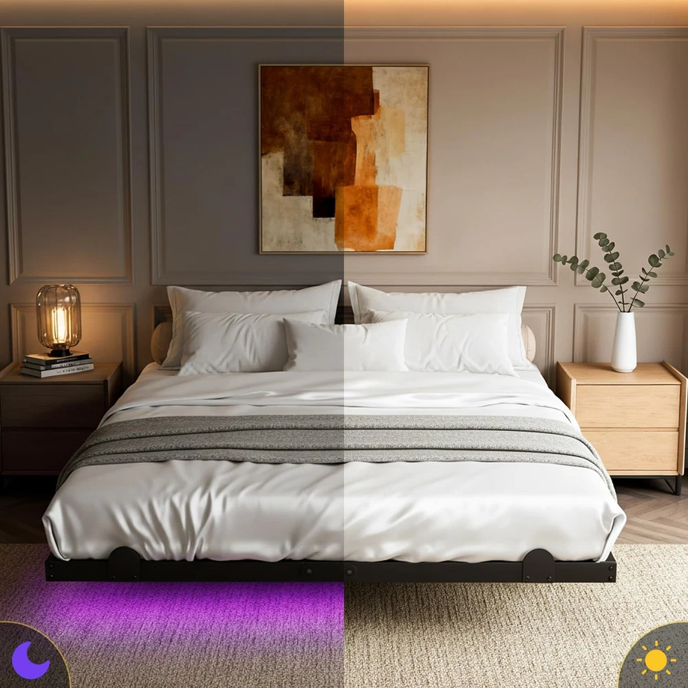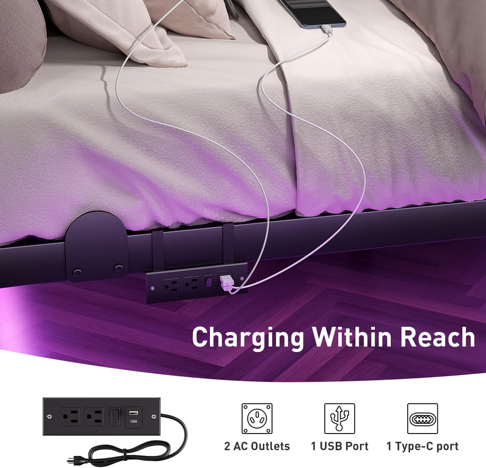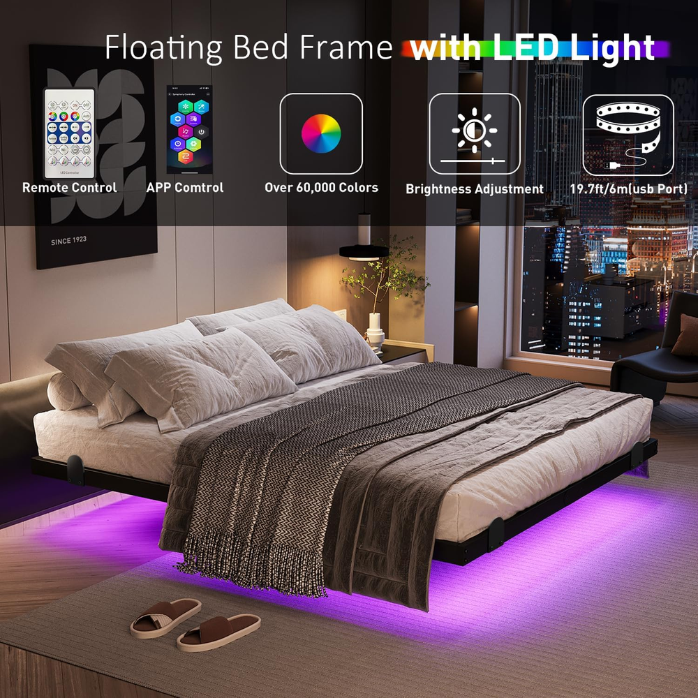 Store New Arrivals Add to Favorite View Feedback Contact Floating Bed Frame with LED Lights and Charging Station 14 Inch King Size Floating Description Included Components USB Size King Finish Type Painted MODERN FLOATING BED FRAME : The king size floating bed frame features an innovative hidden foot design, the legs are not visible from a normal standing view, combined with the three side light strips under the bed, bringing the impression that the bed floats above the ground, this king bed frame is the perfect part to create a modern, technology bedroom SMART LED LIGHTS : The king floating bed frame with colorful RGB lights, there are over 60,000 colors, you can also adjust the light change by APP or key control, you can set the music, voice, and timing modes for a personalized ambiance, to discover more wonderfully CONVENIENT CHARGING STATION: Keep your devices charged and within reach with the convenient charging station on the LED king size bed frame, it features 2 AC outlets, 1 USB port, and 1 Type-C port, making it easy to maintain an organized sleep space and stay connected without having to leave the bed STURDY AND NOISELESS: The king platform bed frame is crafted with durability in mind, featuring 11 stable metal slats and 9 thick legs for superior stability, the metal frame ensures long-lasting sturdiness, with tested connections to guarantee a secure and reliable sleeping experience, it is carefully engineered to distribute weight evenly, minimizing movement or wobbling ABOUT US We offer the best prices around on high quality products. Our E-store includes media such as books, movies, music and games while offering electronics, toys, sporting apparel, clothing, tools, general home, garden items and more. SHIPPING We are always working hard to ensure your package arrives as soon as possible. Please understand that some factors like weather, high postal traffic, and the performance of shipping companies are outside of our control. We offer free shipping to the lower 48 states and ship within 2 business days of payment, usually sooner. We do not accept P.O. Boxes. Please provide a physical address. For shipping outside of the continental USA, we only use eBay's Global Shipping Program.The item is shipped to KY and then sent to the rest of the world. International customers are responsible for all duties and taxes. Continue to check out in order to calculate costs for shipping the item to your country. Messages regarding eBay's Global Shipping Program MUST be directed at eBay EXCLUSIVELY. RETURNS We offer a 30-Day Return Policy on items which you are not completely satisfied with. You have the option for a full-refund or an exchange of the item. No returns are available on items shipped outside of the USA. PAYMENT We accept PayPal. CONTACT US This page content is yet to come Please ad us to your favorite seller and visit again later Thank You CUSTOMER SATISFACTION We try our very best to make sure every customer is completely satisfied. If there's a problem, message us! We're happy to help.