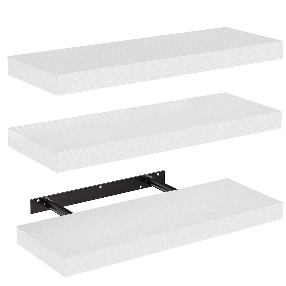 Well-designed Floating Shelves: Our white floating shelves for wall are made of MDF Laminate. These wall shelves can organize daily sundries to tidy your space, display your art pieces on the wall to decorate your home, and make it full of aesthetic flare. Wood Floating Shelves: Each wall shelf measures 5.5"D x 15.7"W x 1.2"H and offers more space to store more items. Our shelves for wall decor create a variety of storage spaces to organize small items on your desktop or counter. Invisible & Sturdy Metal Brackets: Enhanced metal brackets matched with precisely made screws will affix the floating shelves on the wall firmly without sliding or swaying. 1.2-inch thick wood boards can hold up to 20 lbs and safely hold collectibles like photos, trophies, small plant pots, etc. Why Purchase Our Floating Shelves?: With the functional floating shelves for wall, everything will be within reach which can make your life easier and cleaner. Perfect for your living room, bathroom, bedroom, kitchen, etc. Making them a great choice for family or friends. Sturdy and Easy to Assemble: Includes all necessary hardware to make these floating shelves extremely easy to assemble. We also provide you with detailed install instructions for you to install the shelves in a few minutes.