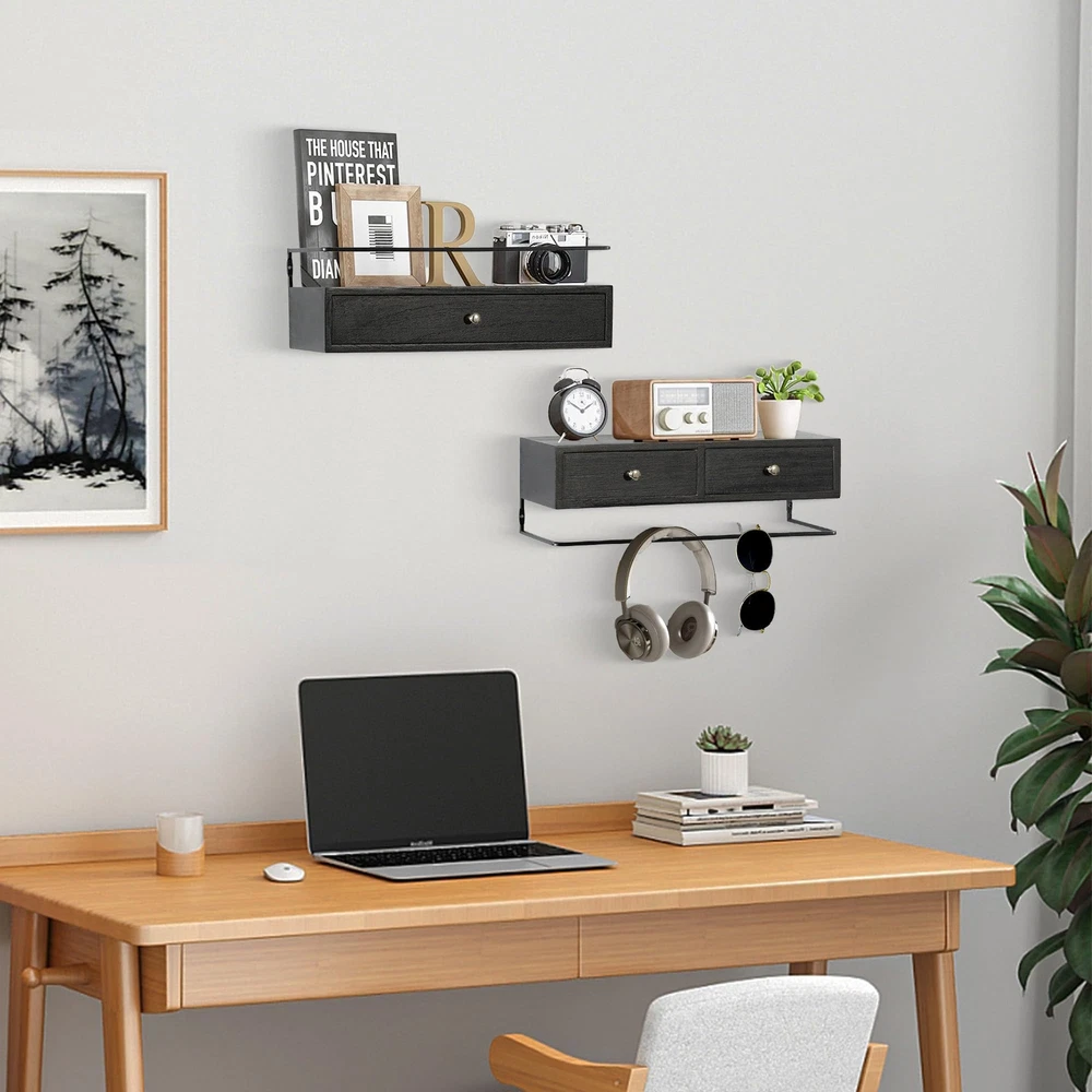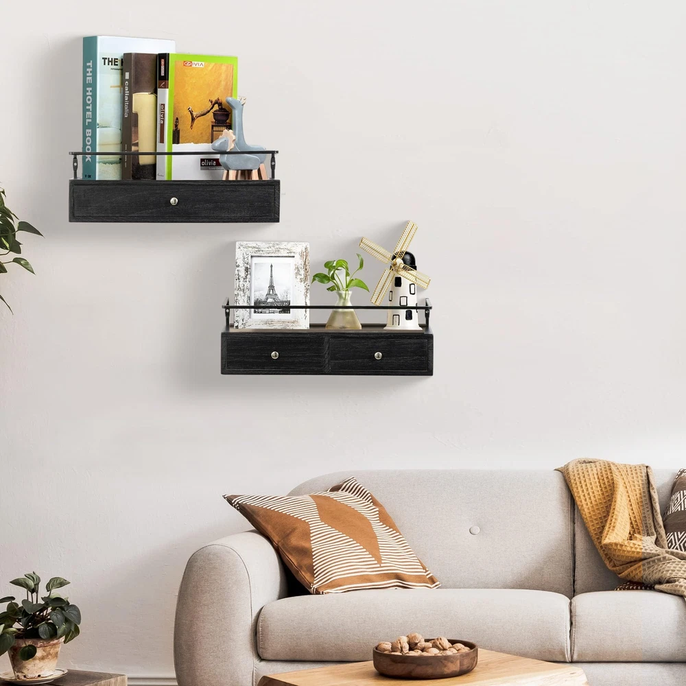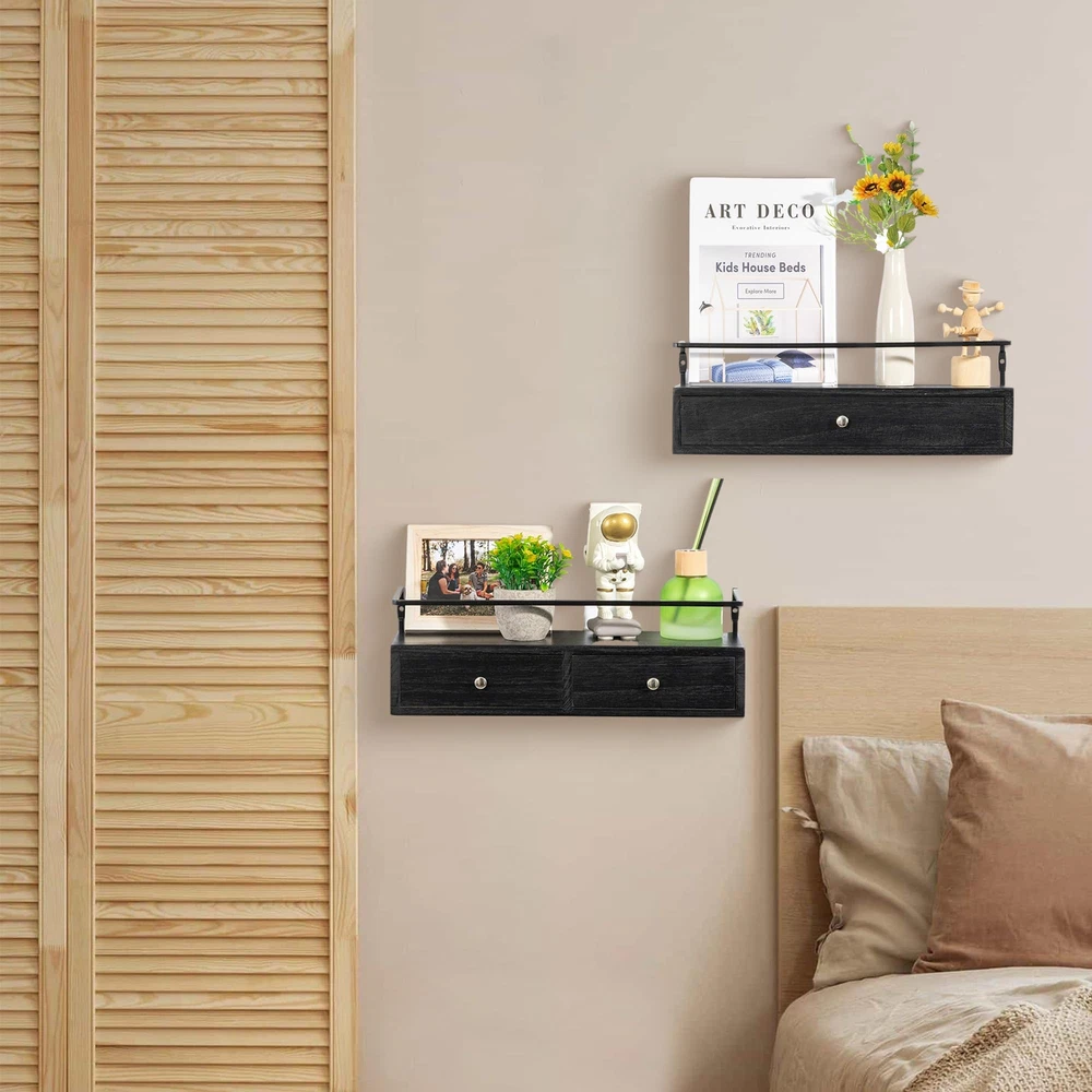 【Rustic Floating Shelves with Drawer】Made of real solid wood and metal, each board retains its natural grain and color, the industrial look is simple and modern, and has applied for a design patent. Make use of the vertical space on the wall, not only increase storage space but also add decoration and beauty. Take this new design shelf back to decorate your home 【Suitable for All Occasions】 In the bathroom, the bathroom shelf can hold skincare items such as shampoo, conditioner, shower , lotions, and perfumes. In the kitchen, the wall shelf can be used to put spice and seasoning bottles. It also can be used in the dining room, bedroom, living room, and office 【Sturdy and Durable】Structure innovation is designed by our experienced designers, with good load-bearing capacity, sturdy enough to hold up to 30 lbs. The protective bar is a plus preventing anything from falling off, it can also be used to hang towels, hair hoops, headphones and other daily items 【Easy to Install】As shown in the picture, there are ways to install the floating shelves. The package include 1 clear installation manual. It only takes a few minutes to the instructions and complete the mounting, then you can create your own storage for wall 【High Quality】They are awesome wall shelves to making them perfect gifts to your family or friends. We always prioritize the needs of our users, and will improve the product based on the issues and suggestions raised by customers. Each shelf is handmade, so please rest assured to use it