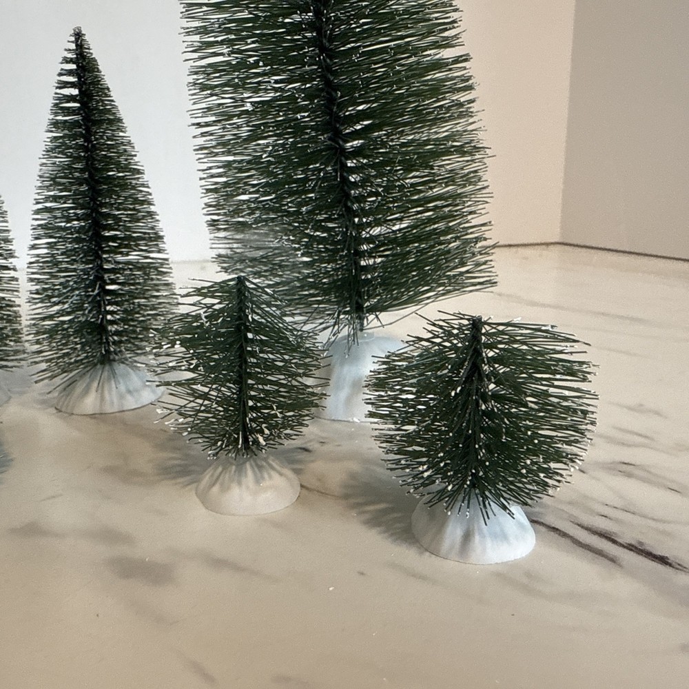 Bottle Brush Trees Christmas Village Flocked Lot of 9 Various Sizes Plastic Base Pre-Owned in very good condition. Made of wire brush, and bendable. The bases are white plastic. Thank you for looking and supporting my small business!