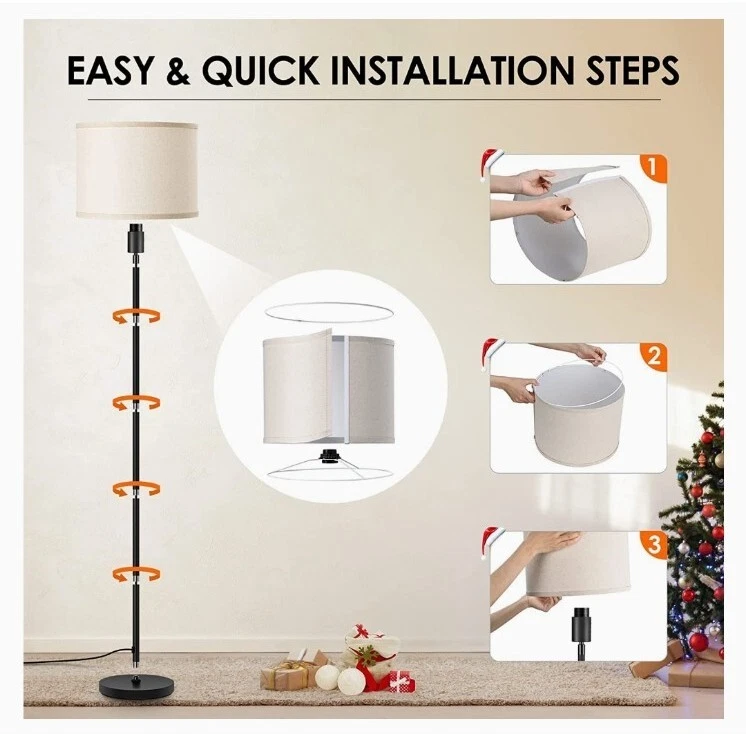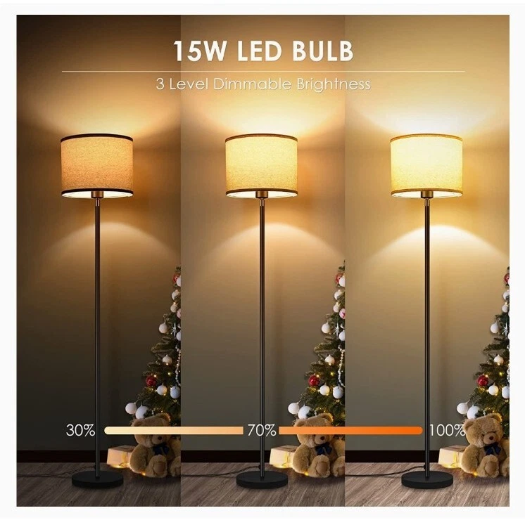 【Easy Assembly and premium quality】Made with a black metal body and a linen lampshade, the vintage floor lamp is simply designed and look good in any surroundings; With a 6lb sturdy base, this 59-inch (5ft) in tall lamp stands steadily and won't tip over easily, which is safe for kids; Without tools required, you just need to screw all the parts together to finish the assembly of this standing lamp; PS. The assembly video is attached to the product page 【Energy-Saving LED Bulb Included】The BoostArea modern floor lamp with linen shade features a 15W LED bulb, which will reduce the electricity bills and maintenance costs compared to incandescent bulbs, saving energy & money; With 3 dimming levels, the brightness of tall lamp could be adjusted from 30% to 70% to 100% as needed; The bright floor lamp could be both wide-area light emitters and soft, subtle mood lighting; Besides, the LED bulb is replaceable for creativeness, Note: E26 only, Max 60W 【Premium Lampshade】Made with premium water oil proof PVC lining and natural linen outer, the lampshade of this farmhouse floor lamp features both elegant-looking and durable, which is easy to clean and non-deformation; Emitting 1500LM and 2700K warm white, the corner floor lamp is bright enough to brighten your room but ease the stress on your eyes; 【Foot Switch and Compatible with smart devices】The LED floor lamp for the bedrooms is controlled by pedal switch, which is easy to turn on/off when you lay on the sofa or bed, and gives the dimmable lamp with shade a clean outlook; To keep path with smart lifestyle, you can plug this standing lamp in the smart device(not included), add it to your home appliances group, and easily controlled it by your phone; intelligent design help you enjoy easier life and home automation 【Sleek Design and Multi-scene Application】The elegant floor lamp is classic, super modern, and very vintage at the same time; It pairs well with any décor style; Whether you want to illuminate a dining table for late-night bottles of wine and card games, a sculpture next to the cozy chair, or just floor lamps for bedrooms, living room, office or classroom, it is a practical option; Besides, Thanks for the space-saving design, the LED lamp is also great in a corner