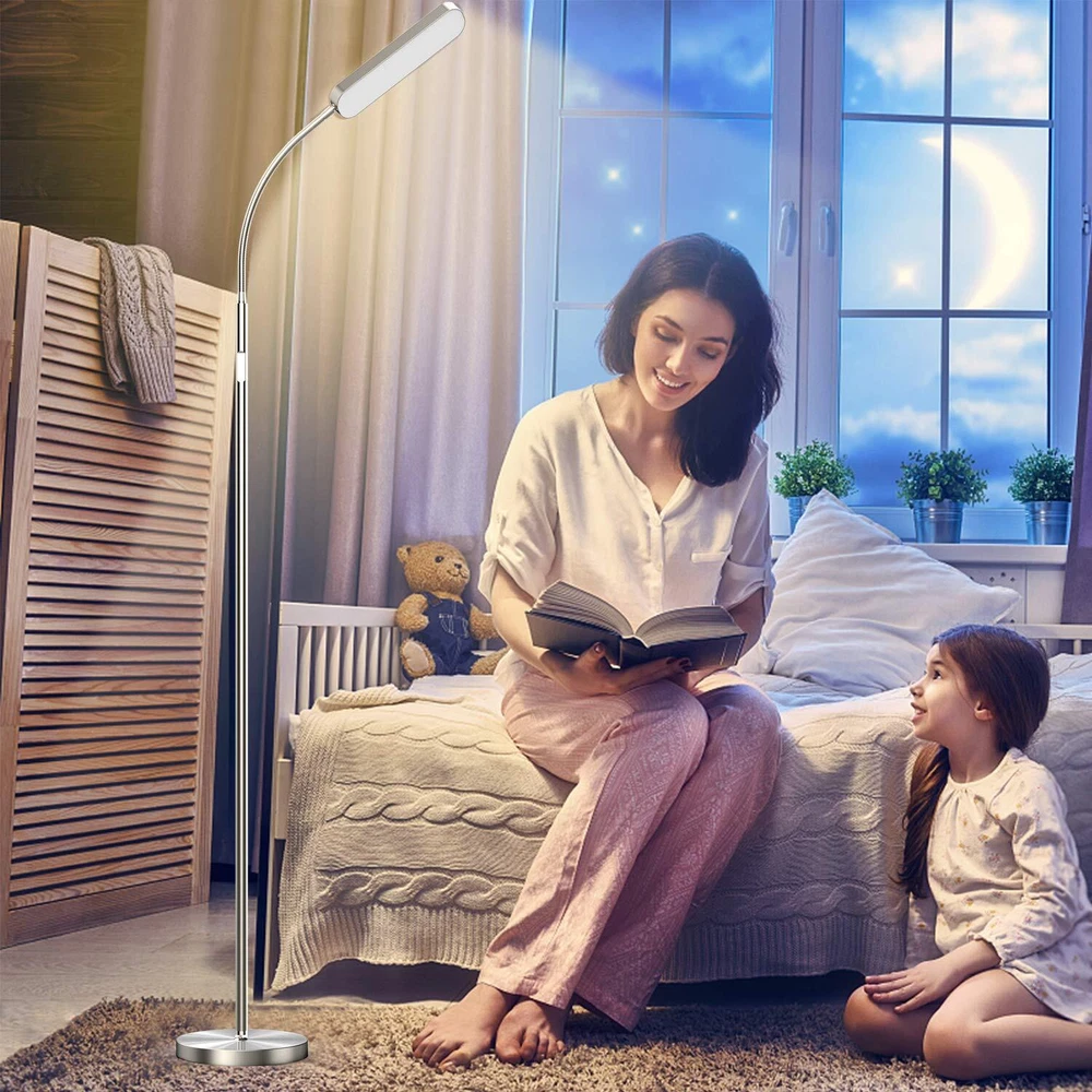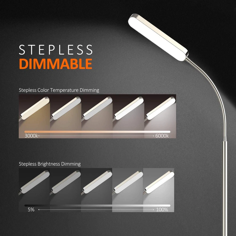 Remote Control; adjust brightness and color temperature steplessly with the remote control from up to 49.2 feet away; customize the lighting mode to suit different environments; the remote includes 6 scenes that can be activated with a single click Touch control; stepless adjust the brightness from 5% to 100% and there are 4 color temperatures that can be adjusted 3000k, 4000k, 5000k, 6000k; upgrade to the superior touch, better feel, better control Bright and Soft Light: Powered by a 15W LED, this lamp generates 1000 lumens, making it ideal for reading in the living room or bedroom, with a lifespan of up to 50,000 hours, it has soft natural light without flicker Memory and Timer Functions; the lamp features a memory function that recalls your last brightness and color settings, along with a timer to help you feel secure and fall asleep easily Flexible gooseneck; the 360-degree adjustable gooseneck can direct the light to the position you need; the gooseneck can be easy bent and will maintain its position after bending