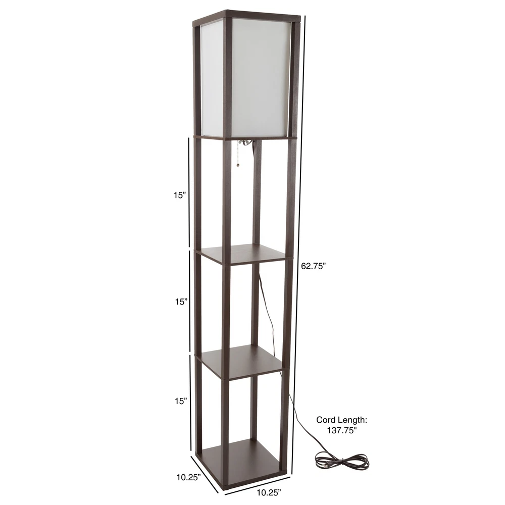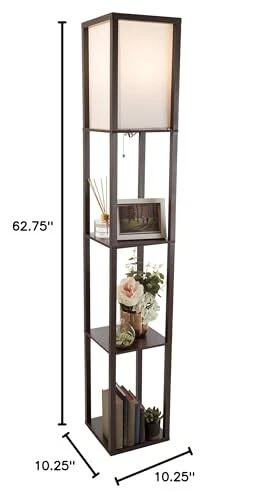 The Etagere Tall Lamp by is a stylish and practical piece that will beautifully illuminate any room of your home. The white fabric shade perfectly diffuses the light for a soft ambient glow, and the included replaceable LED bulb provides an efficient lighting solution. This corner lamp also serves as a convenient storage solution with 3 tiers of open shelving to display photo frames, books, plants, vases, and other accent décor. Use this sleek modern floor lamp for living room lighting or in your bedroom, family room, office, or den. IMPORTANT: is committed to providing the consumer with the absolute best price and value on all of our products. NOTE: This is an exclusive product of and ONLY Floor Lamps for Living Room by are GUARANTEED to be genuine. Avoid buying counterfeit products and transacting with unauthorized sellers. FLOOR LAMP WITH SHELVES – Featuring 3 tiers of shelving, this versatile etagere style standing lamp is a convenient and attractive storage solution. It is a great way to showcase your favorite books, plants, photos, or other small accent décor pieces. AMBIENT LIGHTING – This corner light will complement any home décor style while providing relaxing illumination in your bedroom, living room, or office. The open rectangular fabric shade creates a diffused glow for a soothing atmosphere in any room. ENERGY SAVING EFFICIENCY – The shelf lamp includes one replaceable LED bulb that provides an efficient and long-lasting alternative to traditional incandescent bulbs. The on/off function is controlled by an attractive metal ball pull chain. EASY TO ASSEMBLE – This LED lamp is ready to assemble and comes with clear, easy to follow instructions as well as all the required hardware. The polyester fabric shade is also collapsible for convenient assembly and storage. PRODUCT DETAILS – Materials: Polyester Fabric and MDF Wood with Brown Veneer. Dimensions: (L) 10.25" x (W) 10.25" x (H) 62.75”. Shelf Height: 15”. Cord length: 137.75”. Shelf Capacity: 10lbs. Metal ball pull chain for on/off function. Color: Brown.
