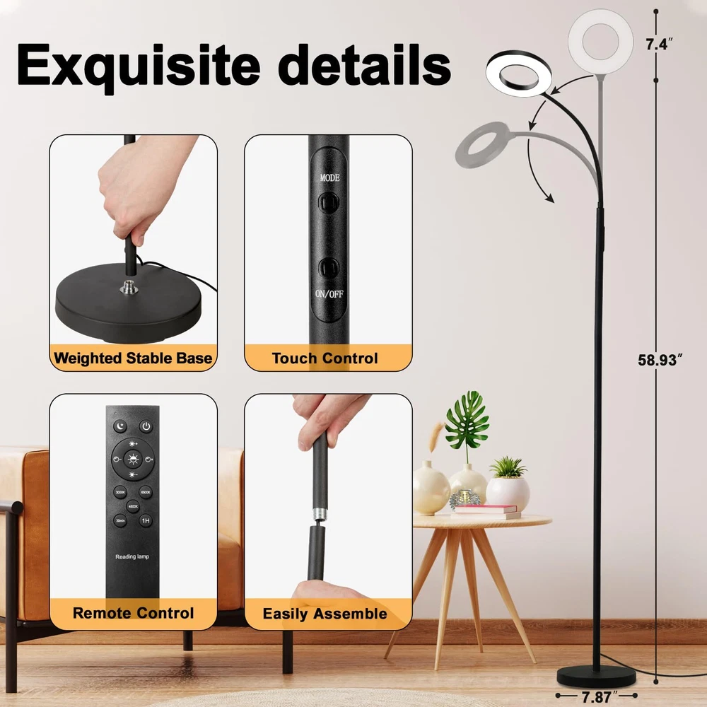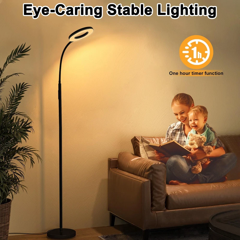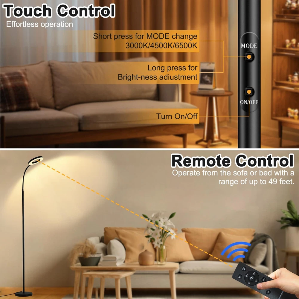 【Adjustable Lamp Head】The adjustable gooseneck design of the floor lamps for living room allows you to effortlessly position the curved black floor lamp head in any direction or angle, while the sturdy construction of the standing lamps for living room ensures that it stays in place and won't sag or flop over, thus ensuring that it maintains the ideal angle while reading, working, or whatever the task may be. 【Crafted with Premium Materials】Standing light for living room- Lasts up to 30% longer than other products. Our LED floor lamp for bedroom integrates anti-glare, energy-efficient LED technology that saves up to 85% energy. The standing lamp's premium acrylic housing emits a soft, eye-friendly light without any flickering, causing no harsh glare or blue light, prioritizing the protection of your and your family's eyes. 【Stepless Dimming & Smart Memory】Unlike other dimmable black floor lamp, ours 12W 1000LM modern tall lamps feature 10%-100% stepless dimmable brightness and 3 color temperature options (warm, warm white, white) ranging from 3000K to 6500K. Reading light for living room corner smart memory function retains your last brightness and color temperature settings, and a timer function to automatically turn off after 30 minutes or 1 hour, adding convenience to your daily life. 【Remote & Touch Control】Our dimmable LED floor lamp with remote includes advanced RF remote control with an impressive range of around 49ft, allowing you to adjust lighting from various rooms. The magnetic remote control can stick to the metal pole, wall plate, or fridge, making it easier to be reached. When the gooseneck reading lamp remote is out of power, the touch switch comes to the rescue. 【Safe Base & Easy to Assemble】The reading lamps for bed (66 inch) with weighted base firmly hold the stand up lamps for living room to prevent the toppling over when the kids or the pets pass it. This bright floor lamp for living room bright lighting is very easy to assemble, just follow the instructions to assemble the arched dimmable floor lamp from the top of the lamp to the base in 3 minutes! 【Certification and 3-year Quality Commitment】 Our LED lampara de pie is FCC, CE and RoHS certified, and the plug is UL listed for added safety. Additionally, enjoy a worry-free 3-year warranty. Reach out to us with any queries.