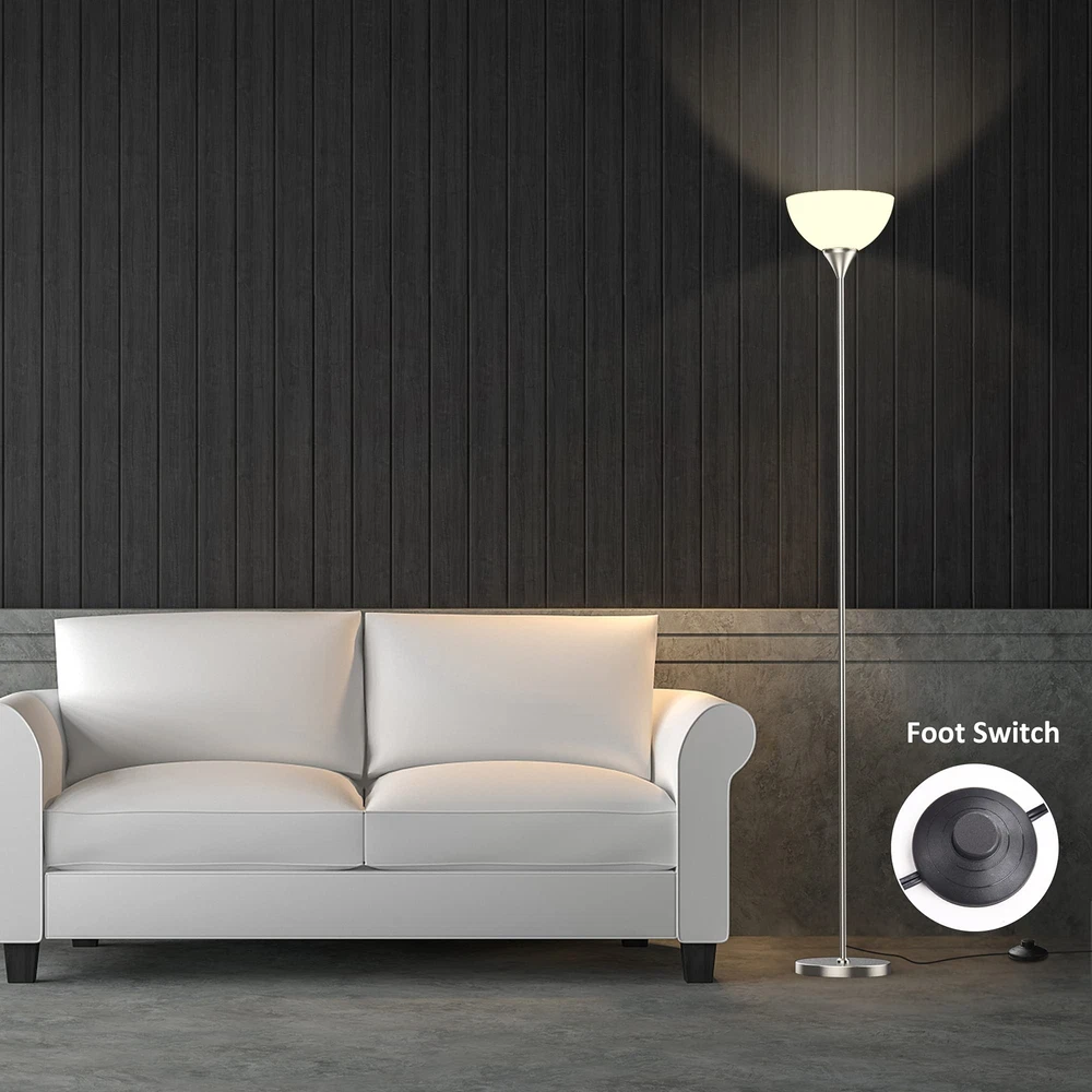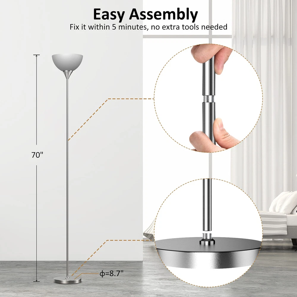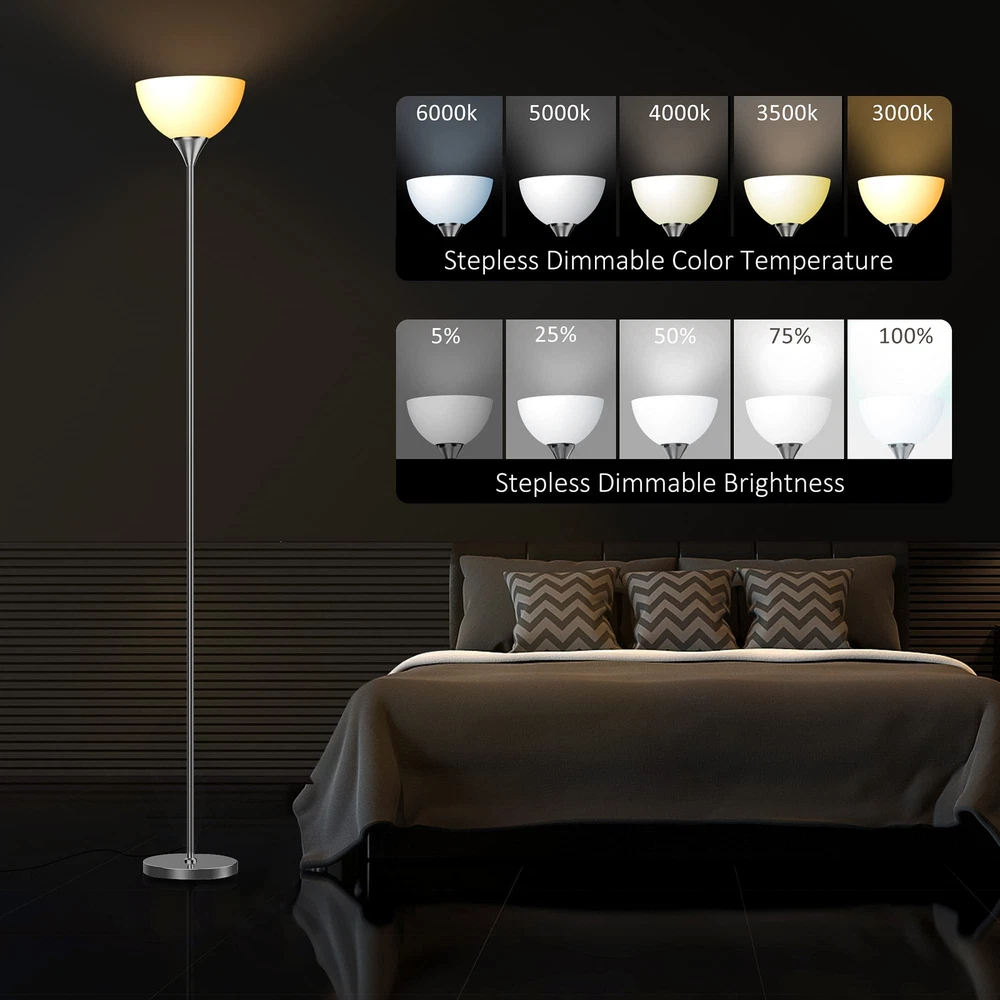 Specifications: LAMP: Material: Metal+PC Power: MAX60W Size: D8.7” * H70” BULB: Power: MAX8W Luminous Flux: 1000LM Dimmable: 5%-100% Color temperature: 3000K-6000K Lifespan:30,000H Remote distance: 39inch Remote battery: 2 * AAA (included) Remote Distance: MAX49.2ft Packing List: 1 * Floor Lamp, 1 * LED Bulb, 1 * Remote Control, 1 * User Manual 1 * Power Adapter Multiple switching modes; remote control and foot switch, The combination of traditional foot switch and remote control makes the tall lamps more convenient and fit for living room, bedrooms Space-saving corner lamp; Standing lamp great for reading room and living room, the sky torchiere floor lamp easily fits beside the couch or in the corner Easy to assembly; no extra tools are required, you only need to screw all the parts of the pole together to complete the assembly of this torchiere floor lamp, assembly has never been easier