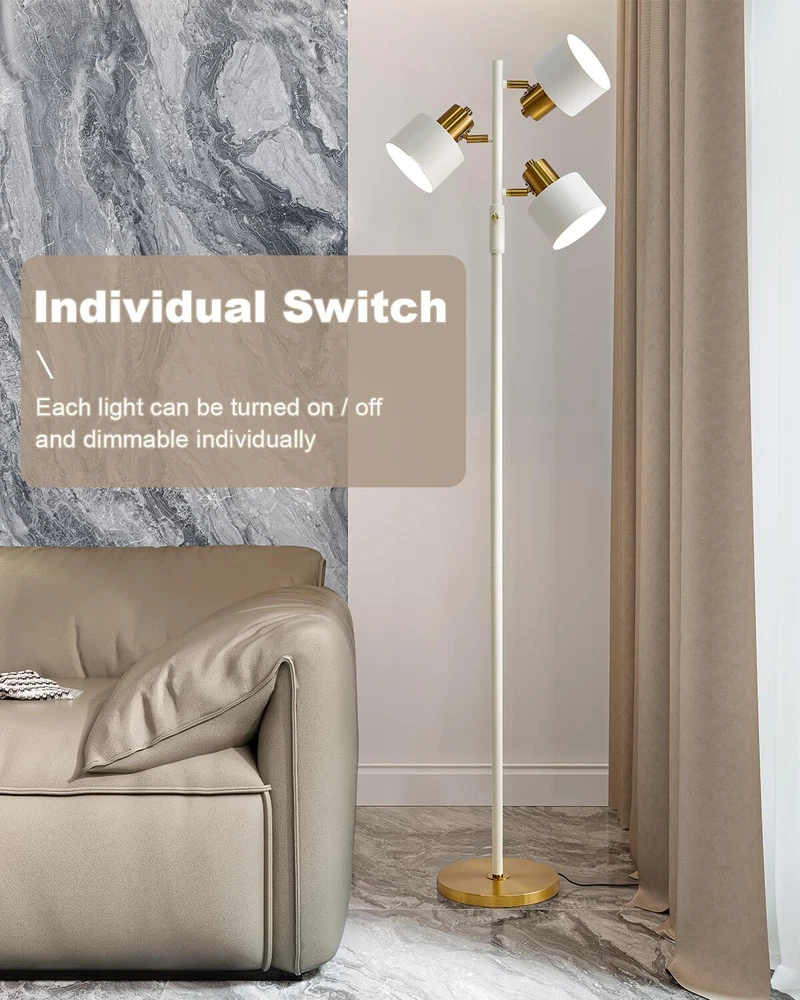Floor Lamps For Living Room Bright Lighting -- The led floor lamp uses a unique 3-light design, each light supports 350° rotation and 180° vertical adjustment, supporting individual control of brightness. With its stylish design and minimalistic sleek lines, the floor lamp for bedroom fits well with modern, urban, casual, and artistic decor styles. Ideal mordern floor lamp, bedroom, office, study, bar, club, restaurant, etc. Standing Lamp -- This corner floor lamp bright lighting is designed for a retro and elegant look that adds a aesthetic decor with beautiful soft ambient light to any space. This modern floor lamp is perfect for your family or friends. Convenient Reading Lamp: Rotary ON/OFF switch on the lamp-post is convenient to turn on/off the tall floor lamp without having to get up and press a wall switch, it fits for any corner on your bedroom or living room. Eye Protection & Easy to Assemble -- This white floor lamp light source is stable without flickering, and creates a soft and smooth atmosphere with light. Prevent eye fatigue, and maintain an even frequency of light delivery, with a purer light. This tall lamp is very easy to put together, just follow the steps in the manual and assemble it from the top of the lamp to the base, and you can finish the assembly in 5 minutes. Safety choice: We attach great importance to the quality of floor lamp with shelves during the production process. E26 base socket is compatible with various bulbs, such as CFL,RGB,Suggest use Edison bulb. Support up to 40 watts maximum. (Note: Bulbs not included)