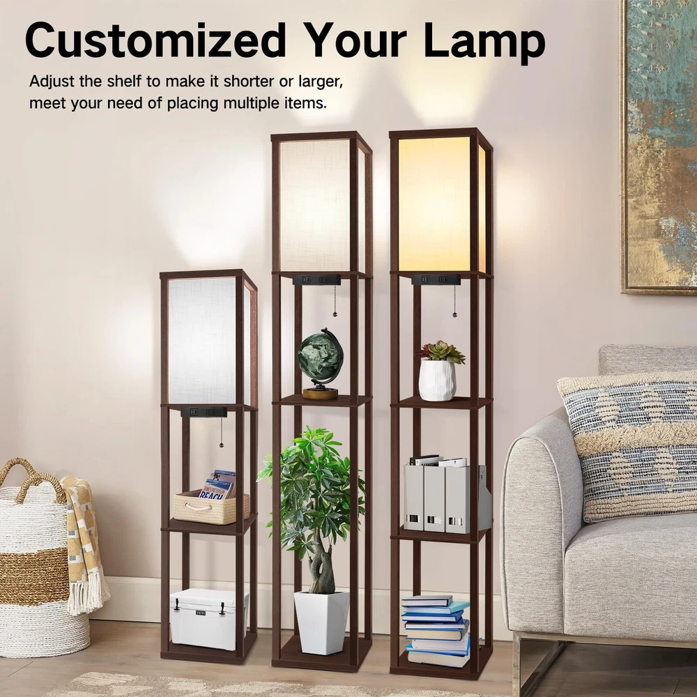 3 Color Temperatures & Long Lifespan: The modern floor lamp comes with a 9 Watt, 810 lumens, 3 Color Temperature(Warm, Cool White, Daylight) power-saving bright LED bulb with 25,000 hours lifespan. Save money and energy. Built-in Pull Chain Switch to turn on/off the lamp easily. This lamp has a Maximum Wattage of 150W and equips with E26 Bulb Base compatible with various bulbs. Meet your different lighting needs and moods. Fast Charging Station & Memory Function: The corner floor lamp built-in 1 type C fast charging port, 1 5V/2A USB port, and 1 power outlet, which allows you to charge devices such as phones, laptops, iPad, and Kindle at the same time. It will reduce the clutter of charging wires in your space and make your life more convenient. The memory feature will remember your choice the next time you turn it on as well, don't need to cycle through every color temperature to get to the desired setting. Minimalism Design & 3-tier Storage: Constructed from wood material, the shelf floor lamp has a modern, stylish look that can be easily coordinated into any contemporary room design. The floor lamp offers ambient illumination and style to any interior space. The 63.7 inch tall floor lamp has three 10.25 inch wide and 15 inch height shelves for quick access storage (the TV remote, phones, tablets, books) and for displaying your family photos, potted plants, decorating elements, vases, and art. Soft Bright Light & Customize Your Lamp: With a simple rectangular shape and a white linen texture shade is open at the top, casts soft and warm glow that's comfort for eyes. It is pretty bright enough for reading. Design with 3 shelves, you can build this without a shelf to make it shorter. Decor every space to your home. Easy to Assemble & Sturdy: The standing floor lamp is easy to assemble within 5 minutes, no tools needed. It weighs only about 12.1 lbs which makes you obviously carry it in your hands. Tough and sturdy enough to hold up to 30 lbs of items on each shelf, you can place anything on each shelf without worrying about wobbling. The lamp has a 9.5 feet cord and thus you can move it around in a room. Comes with Plastic Clips, to help tuck the power cord away making for a neat-looking product overall.