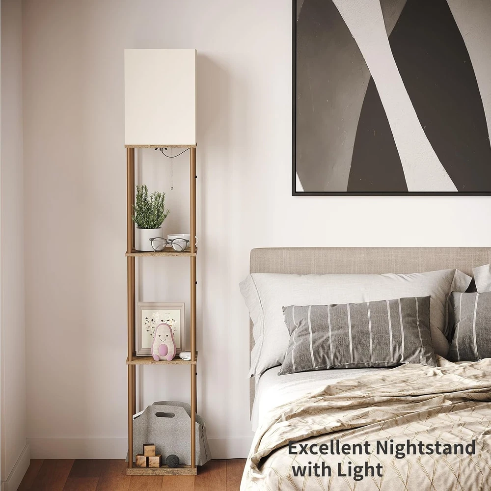3-Color Temperatures LED Bulb Included: SUNMORY shelf lamp includes a 9 Watt, 800 lumen power saving LED bulb, so you don’t need to buy extra bulb. The LED lamp bulb is 3 color temp : 3000K/5000K/4000K. You can switch different color temperatures according to different scenes. Also can work with smart outlets that are Alexa, Google Home Assistant, or Apple HomeKit enabled(requires smart outlet sold separately). Non-glaring Cloth Lampshade: This shelf floor lamp is equipped with a high-quality off-white cloth lampshade and opens upwards. With the built-in three-color temperature bulb, it can be used for both functional lighting and ambient lighting. Storage & Display: This tall lamp has 3 layers of high density fiberboard, each with a maximum weight of more than 50 pounds. On the shelf, you can put decorations such as vases and photo frames, as well as daily necessities such as books and mobile phones. So it can be used as a corner lamp to decorate your living room or as a skinny nightstand with lamp to bring you life convenience. It is very suitable as a gift for Mother's Day, Thanksgiving Day, or Christmas. Minimalist Design & Versatile Style: The contemporary stand up lamp matches asian, mid century modern, rustic, country and farmhouse decor thanks to its diverse lighting effects and simple lines. Easy to Assemble:SUNMORY shelf floor lamp has been improved in craftsmanship and simplified the installation steps. Compared with other similar products, it will save you 30% percent of installation time. The accompanying package comes with the tools needed for assembly and an instruction manual containing text and video installation steps. Simple repetitive operations are very easy for most people. Warm Tip: Please tighten each post to keep the whole lamp stable. Product Description SUNMORY-Light the world, warm your heart SUNMORY is obsessed with providing high-quality lighting and furniture designed for a cozy life. We work to make design inclusive, simple, elegant, and available for various living spaces as well as promoting to light up your life. 1 For your living room 2 For your bedroom 3 For your studyroom 1 Warm Yellow Light 2 Yellowish Light 3 White Daylight Elegant colors, exquisite wood grain. Exquisite texture, suitable for any home style. Compact size Compact size Pull switch Retro pull switch,easy to operate E26 Base & LED Bulb This SUNMORY shelf lamp comes with a 3-color temperature bulb, you can also buy a bulb that matches the E26 base, like A19/ST64/ST58. Robust & Easy to Assembly SUNMORY shelf floor lamp has been improved in craftsmanship. Compared with similar products, it will save you 30% installation time. Strong & Durable Shelves Each shelf is made of high-density fiberboard, with a maximum load-bearing capacity of more than 50 pounds. You can place heavy objects like books. Quality Lampshade & Soft Light Equipped with a high quality fabric lampshade, this tall lamp has a elegant look that suits all furnishing style. SUNMORY Modern Floor Lamps for Living Room,Bedroom,Office,Study Room,Nursery Room The floor lamp has the dual identity of lighting and decoration. It is a master of creating atmosphere and a decoration expert of matching furniture.