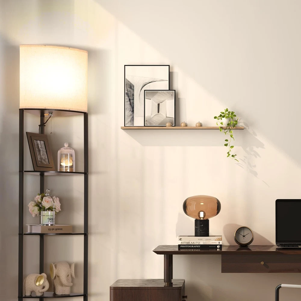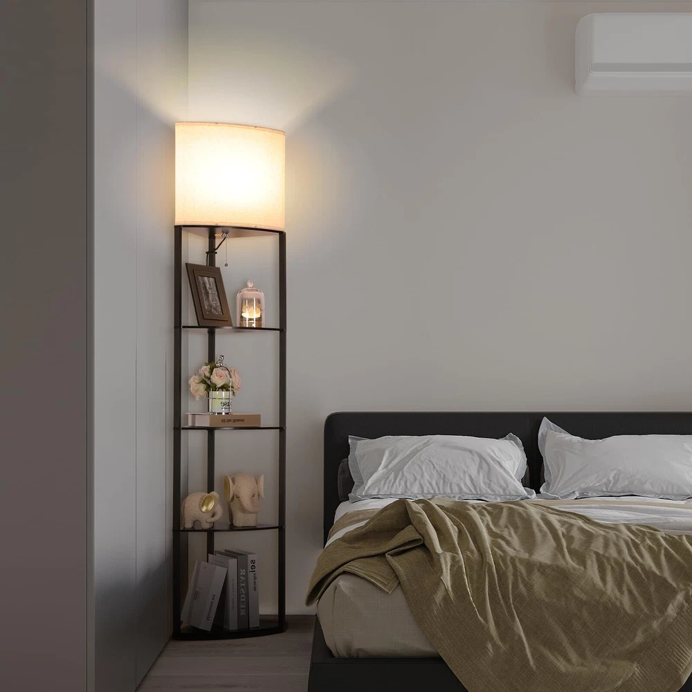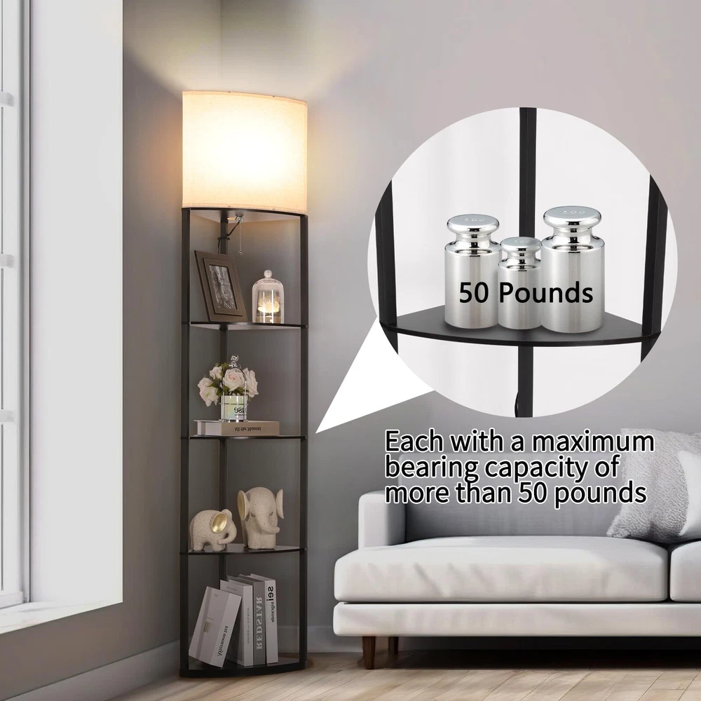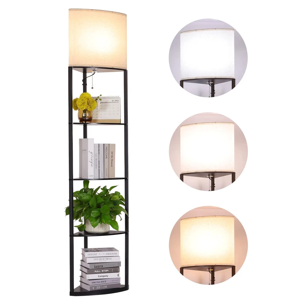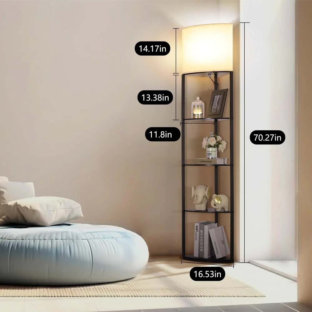 【Space-saving design】 corner floor lamp for uses a fan-shaped design is suitable for placing in the corner of the wall, and the 90-degree angle design fits the wall. It is both beautiful and decorative, and also increases storage space , which is simple and elegant, and can be used as a decorative shelf for the home. Blend seamlessly into your living room, bedroom or office. It can be used to place objects or for custom lighting. It is very suitable as a gift for Mother's Day, Thanksgiving Day, or Christmas. 【Storage space 】Our floor lamps maximize your storage potential with 4 layers of high density fiberboard, each with a maximum weight of over 50 pounds, providing plenty of space to display your precious photos, books and plants. as well as daily necessities such as mobile phones. This larger storage floor lamp is both practical and decorative for your home and matches perfectly with your furniture. 【3 color temperatures】lamp holder built-in 9 watt 3 color temperature energy-saving LED bulb, can emit (3000K warm light, 4500K natural light, 6500K white light), Use non-glare cloth linen lampshade, emitted light will not harm the eyes. And can manually switch the light freely to create a perfect atmosphere for different scenes. So you don't need to buy extra bulbs. 【Quality Lampshade with Soft Light】Equipped with a high quality fabric lampshade, this tall lamp has a elegant look that suits all furnishing style. The lighting through the lampshade becomes soft and gentle, creating a cozy and comfortable atmosphere at night and protecting your eyes from direct light while reading or studying. 【Easy to assemble 】shelf floor lamps have been structurally upgraded to simplify installation steps. In comparison, it will save you 50% of installation time. Save you assembly time, which is what we are after.The package comes with the tools needed for assembly and an instruction manual with text and video installation steps.Tips: Please tighten each lamp post to maintain the stability of the whole lamp.