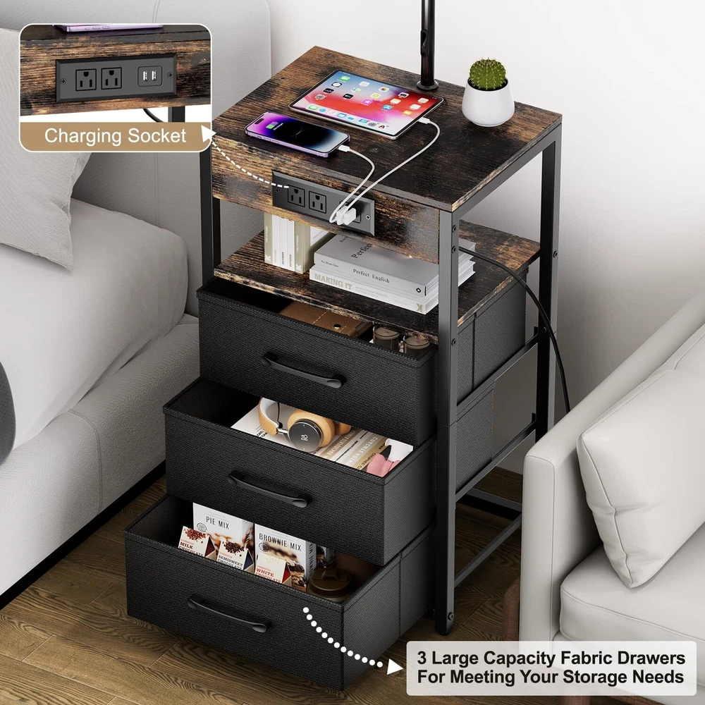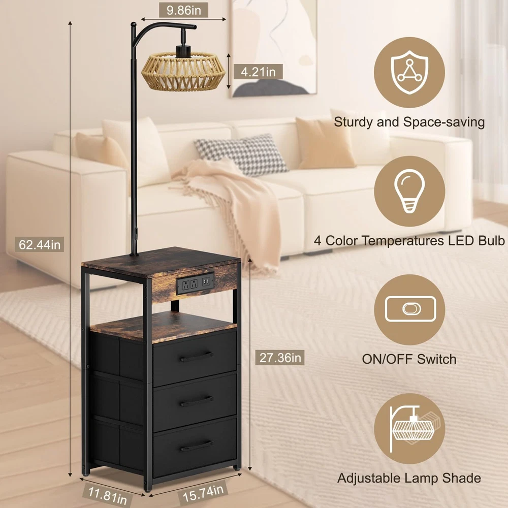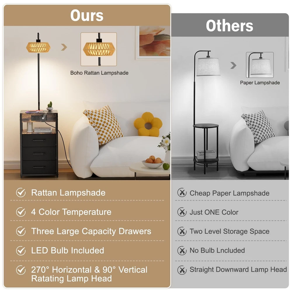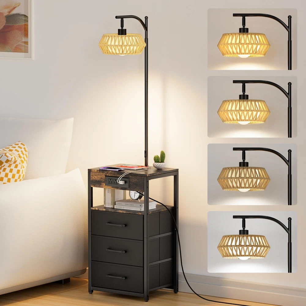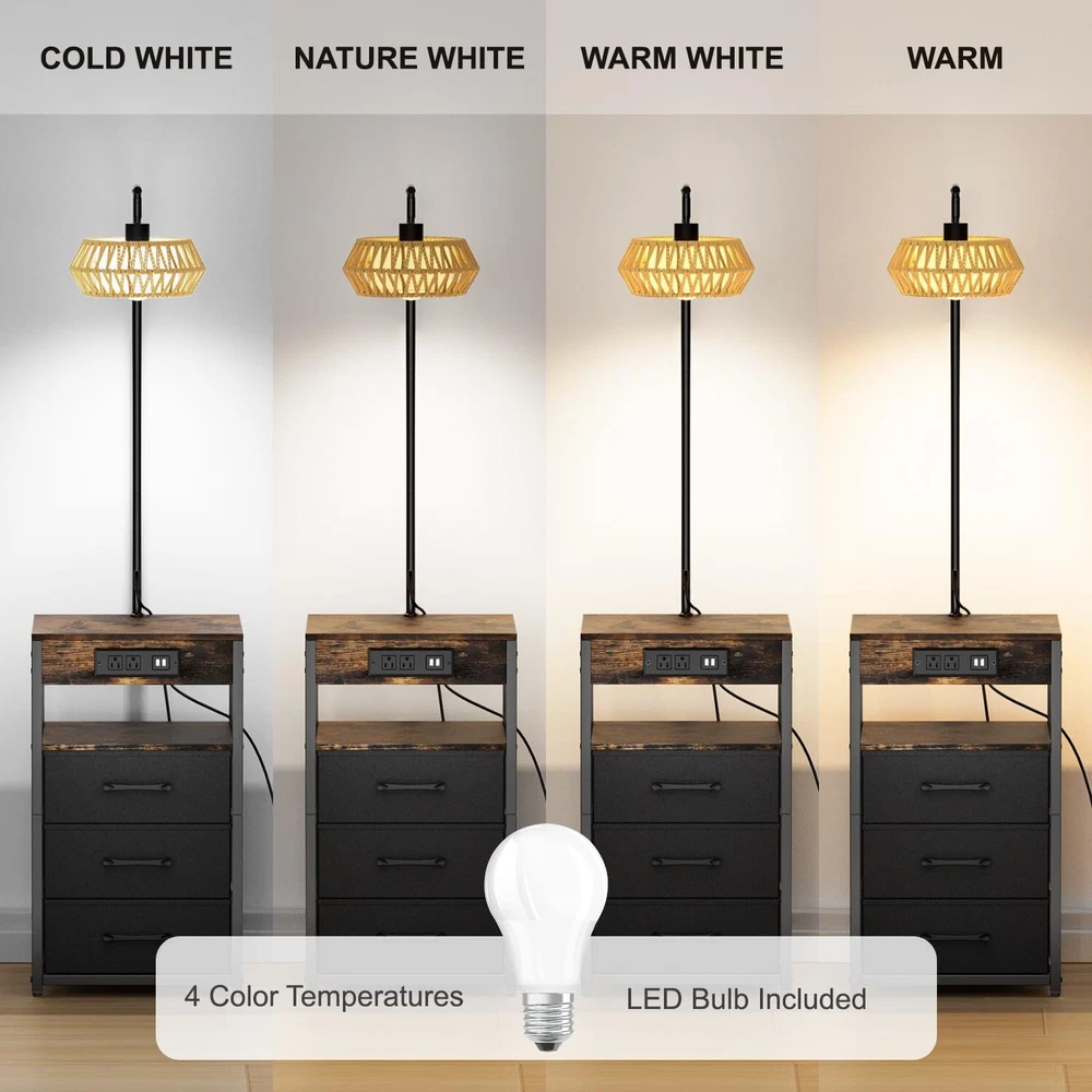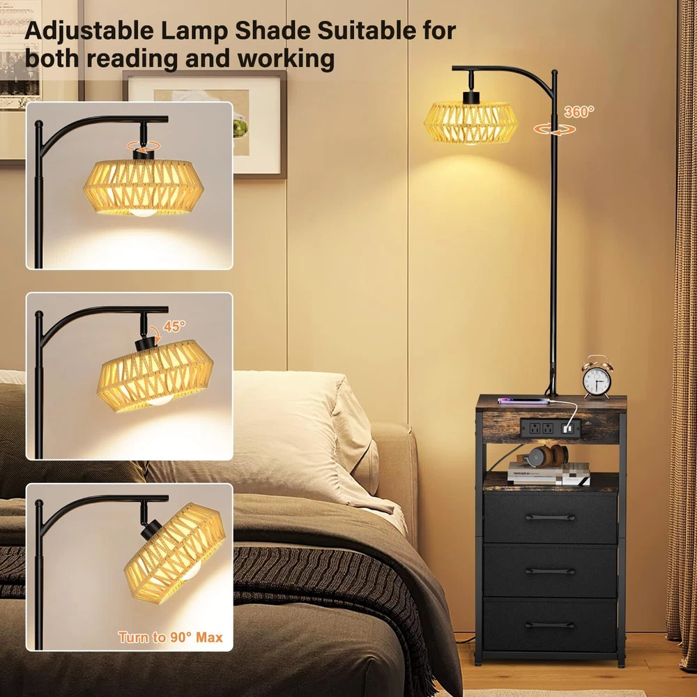 💡[INTEGRATED FLOOR LAMP WITH BUILT-IN DRAWER AND SHELF]--The boho floor lamp with table is a multifunctional piece of furniture that combines a side table with lamp. It not only provides storage but also serves as a table and offers lighting. floor lamps for living room is versatile for various settings. the side table with lamp can be placed beside the bed, beside the sofa, beside the TV, or beside the recliner according to your personal preference to meet your different needs. 💡[MORE STORAGE SPACE-3 DRAWERS]--Our nightstands with drawers features three non-woven fabric drawers, each with a load-bearing capacity of up to 12 lbs. Our table lamp making them easy for storing your personal belongings and necessities. Simply pull the drawer open with ease, and they are also easy to clean and maintain. 💡[2 CHARGING USB PORTS AND 2 POWER SOCKET]--This end tables living room has 2 USB ports & 2 Standard Plug Outlets. The floor lamp with table with a charging station is very convenient for charging your phone, iPad, and other electronic devices, no need to look around—it’s within your arm’s reach. 💡[4 COLOR TEMPERATURE BULB INCLUDED]--Our lamp with shelves comes with four color temperature bulbs: 3000K to 6500K. Compared to halogen lamps, it saves more than 85% on electricity bills and has a longer lifespan, with a smaller environmental impact. With just a press of a button, you can change the ambiance of the room and provide various settings for different scenarios, such as reading, parenting, working, and a night light. 💡[ADJUSTABLE BOHO RATTAN LAMPSHADE]--Our floor lamps for living room come with a rotating head, and the rattan lamp shade of the table lamps for living room can be be rotated horizontally or vertically. You can adjust the angle of the boho lampshade to your liking, which is very suitable for reading and working. It can be used for both bedside and the table side in a study room. 💡[CONVENIENT PUSH SWITCH]-- The floor lamp with table is operated by a push switch that is built into the power cord. With the purpose of saving you time looking for compatible bulbs, our floor lamp with shelves comes with an E26 LED bulb. You can easily turn it on/off, adjust brightness, and change colors using the buttons. 💡[EASY TO ASSEMBLE]--A user manual for the table lamp for bedroom is included in our package upon purchase. It provides detailed instructions for installing the night stand lamp according to the video, and the installation process doesn't take too long to complete. If your night stand with drawers has any defects or stops working, we will assist you with troubleshooting or send you a brand new product.