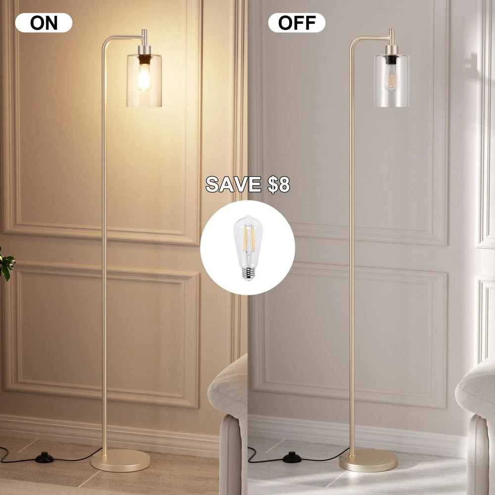 【Gold Floor Lamp with Modern Design】 - 64.5" floor lamp design style is simple and modern, and can match different styles of furniture you want. Tall lamp will transform your home decor into a rustic and farmhouse atmosphere. Gold standing lamp can fit perfectly in your living room, bedroom, corner or office and take up very little room and has a classy, look to it. Floor lamps for living room bright lighting both blends in and provides unassuming accent to the space. 【Replaceable LED Bulb】- Modern floor lamp with 3000K/6W LED bulb provides warm white light to create a comfortable atmosphere for your home. It's also brighter than those ordinary lamps and can light up a larger space in your home. This light bulb is replaceable and can be changed to the type you want according to your preferences. We have already provided you with a ST58 bulb, so you don't need to buy any more. 【Heavy Base, Safe to Use】- Industrial floor lamp has a highly stable base and lamp pole and can stand firmly on the floor, which prevents the elderly, children and pets from being overturned. The standing light is equipped with a rust-resistant gold metal body and a sturdy clear glass shade, which makes it look gorgeous and expensive. Based on the moderate weight of pole lamp, you can easily place it anywhere you want. 【Foot Pedal Switch, Liberate Your Hands】- In order to bring more convenience to your daily life, we specially chose the foot switch design for floor lamp. The on/off switch is a push button that sits on the floor so you could press it with your foot easily. With the simple flick of a switch, you can get lighting or not. Easy to operate, greatly liberate your hands! 【Easy to Assemble】 - This living room lamp can be easily assembled without tools, as all the detachable components are included in the package. In just a few minutes, you can the instructions to put all parts of the tall lamp together. Instructions are included in the package, and assembly are attached to the product page.