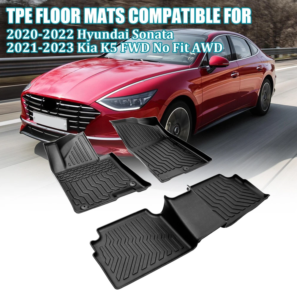 Specification Type: Floor Mats Set Material: Rubber, TPE Color: BLACK Placement on Vehicle: Front, Left, Right, Second Row Surface Finish: Rubber Unit: 3pcs Notice: Only Fits FWD Models Package Dimensions (LengthxWidthxHeight:inch): 33.07*23.62*7.87 Package Weight (LB): 11.13 Fitment 2021-2023 Kia K5 2020-2023 Hyundai Sonata Features & Benefits 1. Precise 3D Laser Measurement: Our floor mats are designed with a precise 3D laser measurement of the vehicle interior surface, ensuring a perfect fit to protect your car from dirt and damage. 2. Perfect Fit and Protection: These floor mats are custom fit for your vehicle, offering maximum coverage and protection for your car's interior. They effectively keep dirt, debris, and spills from damaging your vehicle's flooring. 3. Durable and Safe: Made from durable TPE material, these mats are designed to last. They do not have an irritating smell and are safe as they do not emit any toxic substances. 4. All-Weather Protection: Our floor mats provide all-weather protection to your car's interior. They are designed with unique channels and raised edges to effectively trap liquid, snow, sand, and more, ensuring no slipping and keeping your car clean and tidy. 5. Easy to Clean: These floor mats are easy to clean and maintain. They help keep your car and shoes clean, making them an excellent addition to any vehicle. On Nov 22, 2024 at 00:30:00 PST, seller added the following information: On Nov 22, 2024 at 01:54:15 PST, seller added the following information: