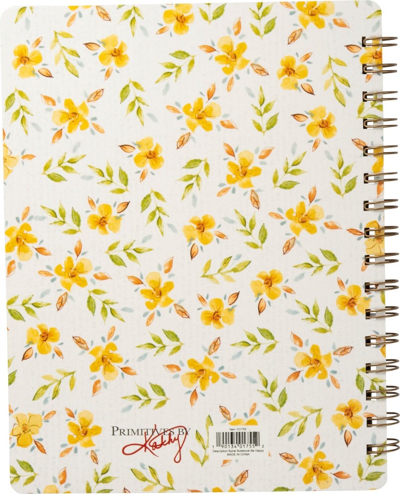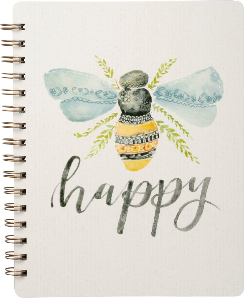 A spiral notebook featuring a front "Happy" sentiment with bumblebee design and reverse back cover floral print. Contains 120 lined pages. Complements well with coordinating pieces in collection for a refreshing spring display. Artist: Annie Quigley Materials: Paper, Metal Dimensions: 7" x 9" x 0.50" UPC Code: 190134017552