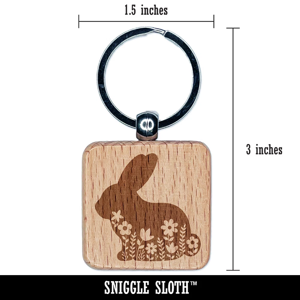 Floral Bunny Easter Engraved Wood Square Keychain Tag Charm