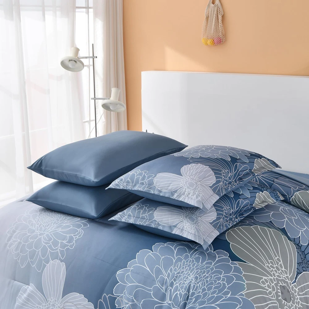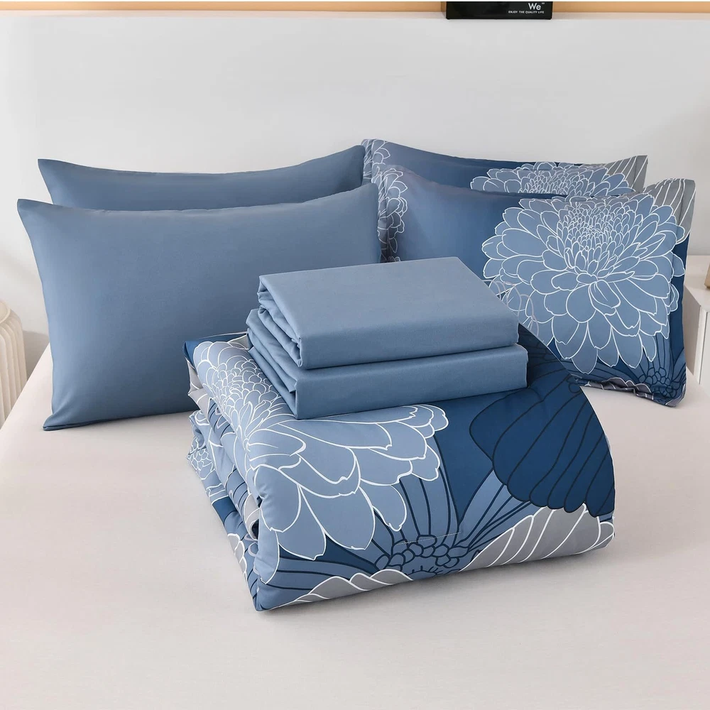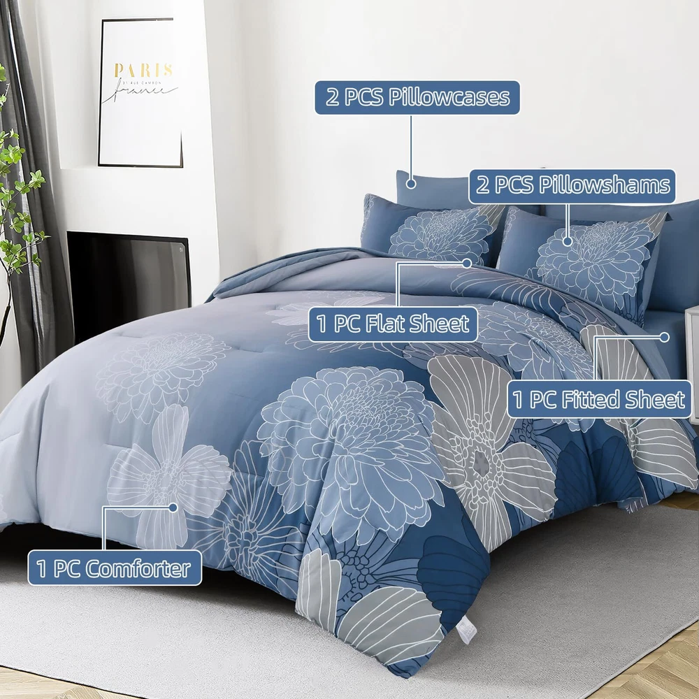 【Complete Bedding Set】Includes 1 comforter(90"x90"), 1 Flat Sheet(90"x102"),1 Fitted Sheet(60"x80"+12"),2 Standard Pillowshams(20"x26"),2 Standard Pillowcases(20"x30").Everything you need to create a cozy and stylish bedroom. 【Floral Design】The floral chic pattern of the comforter adds a bold and vibrant touch to your bedroom decor.The unique design is perfect for those who want to add a touch of fashion style to their home. 【Soft and fluffy】Made of high-quality microfiber fabric and polyester filling,this bedding set is soft,fluffy,comfortable,and lightweight. You'll enjoy a deep and restful sleep all night long. 【Expert Craftsmanship】The tight stitching process used in this bedding set prevents the quilt from moving and clumping,ensuring that you'll enjoy a comfortable sleep.The set is durable and suitable for all seasons,so you can use it year-round. 【Easy Care】This 7-piece bedding set is machine washable in cold water on a gentle cycle.Tumble dry on low temperature and do not bleach.The colors will stay bright and vibrant even after repeated washes.