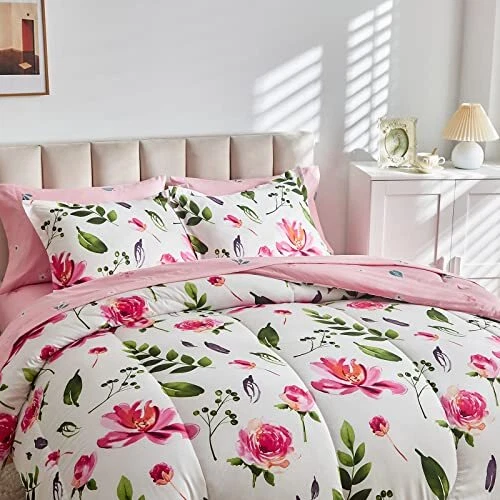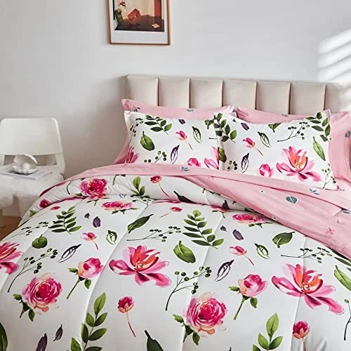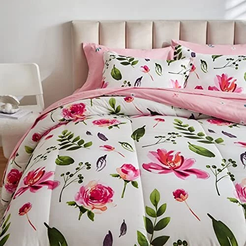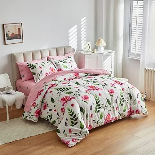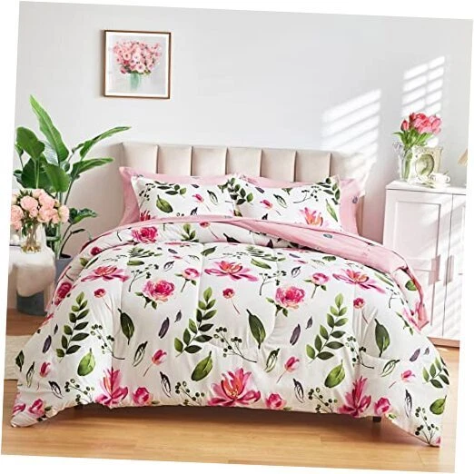 Return Policy Fast Delivery Trusted seller Floral Comforter Sheet Set 7 Pieces Bed in a Bag Queen Size White with Green Leaves Pink Flowers Reversible Bedding Set (1 Comforter 2 Pillow Shams 1 Flat Sheet 1 Fitted Sheet 2 Pillowcases) Product Description Style:All season design Comforter - Red Flower on White Style. Great style for anyone. Gift choice for any holiday! Bed in a Bag design, Just open it. WHAT IN THE PACKAGE:7 Pieces Queen Size Bed in a bag including 1 comforter 88”x88”, 2 pillow shams 20”x26”, 1 Queen Fitted Sheet 60" W x 80" L + 12", 1 Queen Flat Sheet 90" W x 102" L, 2 Standard Pillowcases 20" W x 30", The fitted sheet is 12 inch Pocket. Fits mattresses up to 12". MATERIAL: Our comforter is made with 100% microfiber outer fabric and ultra soft microfiber inner fill. It is Durable, breathable and machine washable. 90GSM Out fabric and 300GSM MICROFIBER FILLING help you get warm very easy in cold weather. The sheets, pillow shams or pillow cases are made on 90GSM fabric, very soft and comfortable for a whole night sleep. Easy Care: Design for all season, You can use it in summer. Machine wash cold separately on gentle/delicate cycle. Tumble dry on low. CUSTOMER SERVICE INCLUDED -- If you have any question about our product, please feel free to contact us on . Uozzi Home will help you in 24h :) Shipping Returns Payment Shipping Shipping is FREE to all addresses other than APO/PO boxes in the lower 48 states. All our stock ships from US-based warehouses. Shipped via USPS or UPS (depending on location and package weight) Unless stated otherwise, all orders will ship within 24-72 hours of your payment being processed. Check our feedback to see the great reviews of FAST shipping we offer. Returns Seller does not accept returns Payment We currently accept payment via eBay managed payments only. Once payment is cleared, we will dispatch your shipment within 1-3 business days. Please refer to the "Shipping" tab for more information regarding shipping speed to your destination.