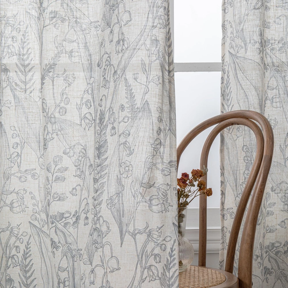 Light-filtering linen curtains decorate your home better! These premium Semi-Sheer curtains provide better privacy and Avoid direct sunlight to our eyes, and the room can also have plenty of natural sunlight. Apply to a farmhouse, bedroom, living room, guest room, dining room, home office, and any other place. BASIC INFORMATION: Includes 2 curtain panels, each measuring 52 inches wide for a total of 104 inches. Each panel with 8 grommets (1.6" in diameter)fit standard or decorative curtains rod. UNIQUE MATERIAL: The curtains adopt the linen polyester blend fabric, The linen makes them look and feel aesthetic while the polyester makes them drape so nicely and keeps them largely wrinkle-free, add a refined style to the room. LIGHT FILTERING SEMI SHEER: Unlike ordinary sheer curtains, the woven texture in the fabric is not too sheer, which protecting privacy while properly allowing enough natural light to flow into the room during the day. UNIQUE HOME DECOR: Designed with lily of the valley flower pattern, which bring you the feeling of fresh and elegant. And design choices of different colors and patterns match your living room, bedroom, dining room, kitchen bathroom, and farmhouse, update the look for your room. EASY CARE: Machine washable in cold water, gentle cycle, tumble dry. warm iron if needed.