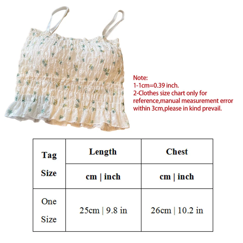 Package:1 pcs Camisole(Other Accessories are not included) Material:spandex Colors:blue,yellow,green,pink Size:Length:25cm, Bust:26cm Sleeve Length:Sleeveless Pattern:Floral Printed Thickness:Thin With Pad:Yes Season:Spring,Summer,Autumn,Winter Occasion:Family,Party,Beach,Holiday Garment:Hand washing or machine washing,line dry. Attentions: 1.The Real Object May Exist Slightly Colors Differences Compared To Images As Different Computers Display.Caution If Minding,Thanks. 2.There Might Be A Manual Measuring 1-3 cm Error.Sorry For Any Inconvenience. 3.Please Prevail On Real Item, Model Images For Reference Only. 4.Attention!!!Please check the size chart carefully before placing the order.