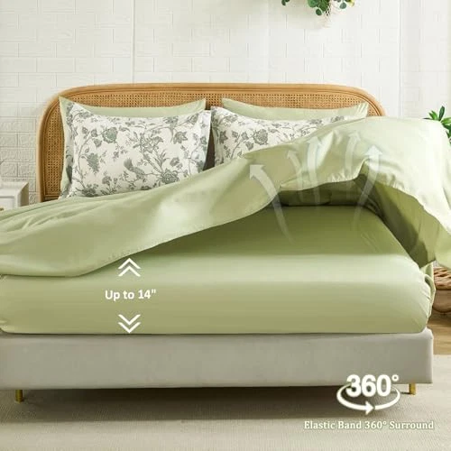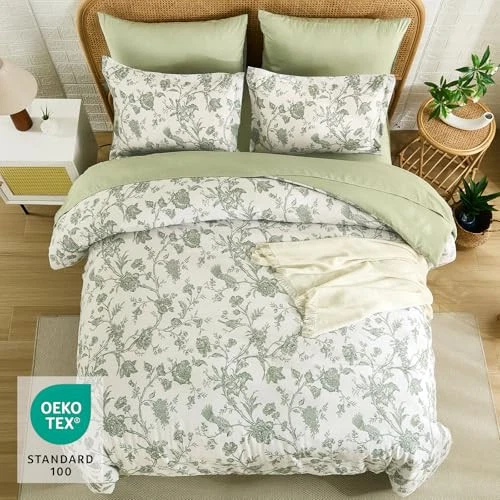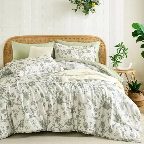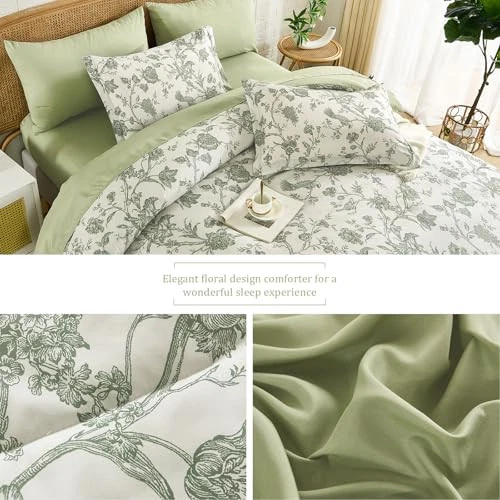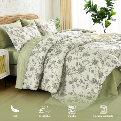 Floral Queen Comforter Set 7 Pieces Bed in a Bag, Sage Green Flower with Bird