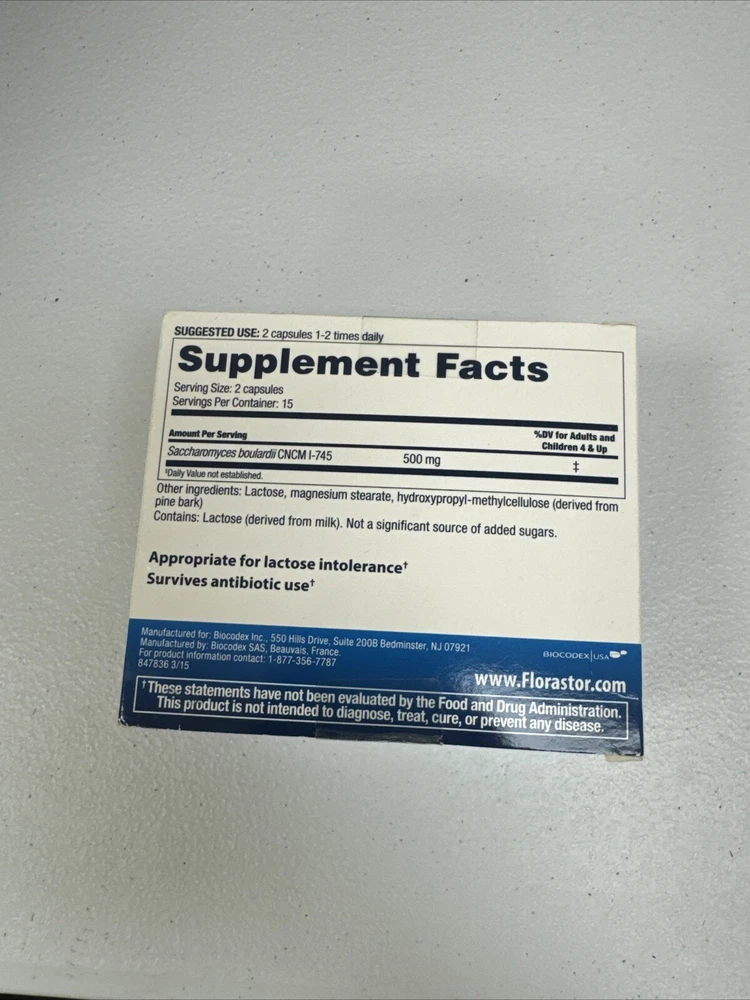 Department: Adult Main Purpose: Immune Support, Digestive Support Dosage: 250mg gtin13: 0704142000354 Number of Pills: 30 UPC: 0704142000354 Brand: Florastor Administration: Oral Body Area: Read Labels Type: Probiotics Formulation: Capsule Expiration Date: 11/24 Features: Gluten-Free Active Ingredients: Probiotic MPN: B01N4E0LVB