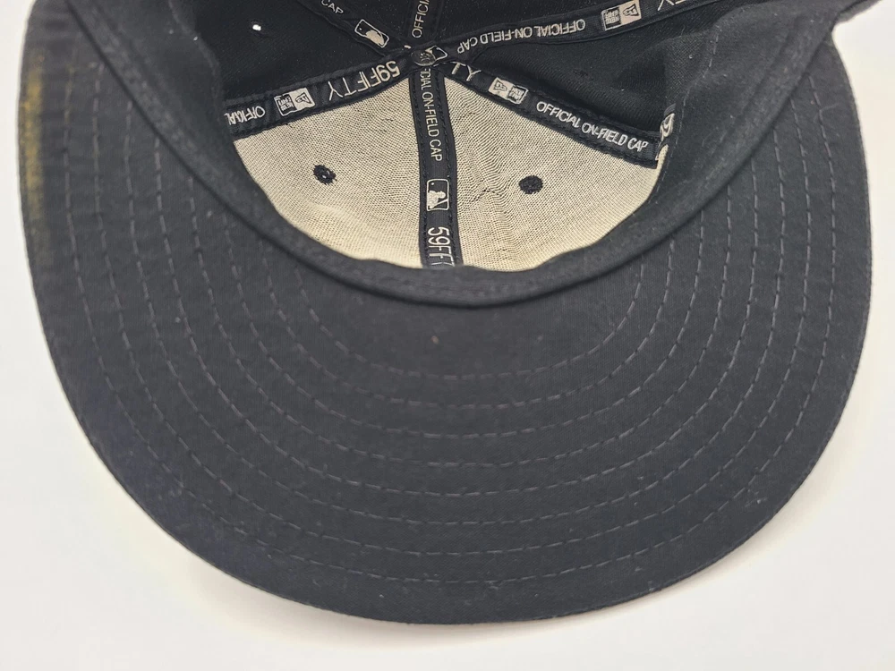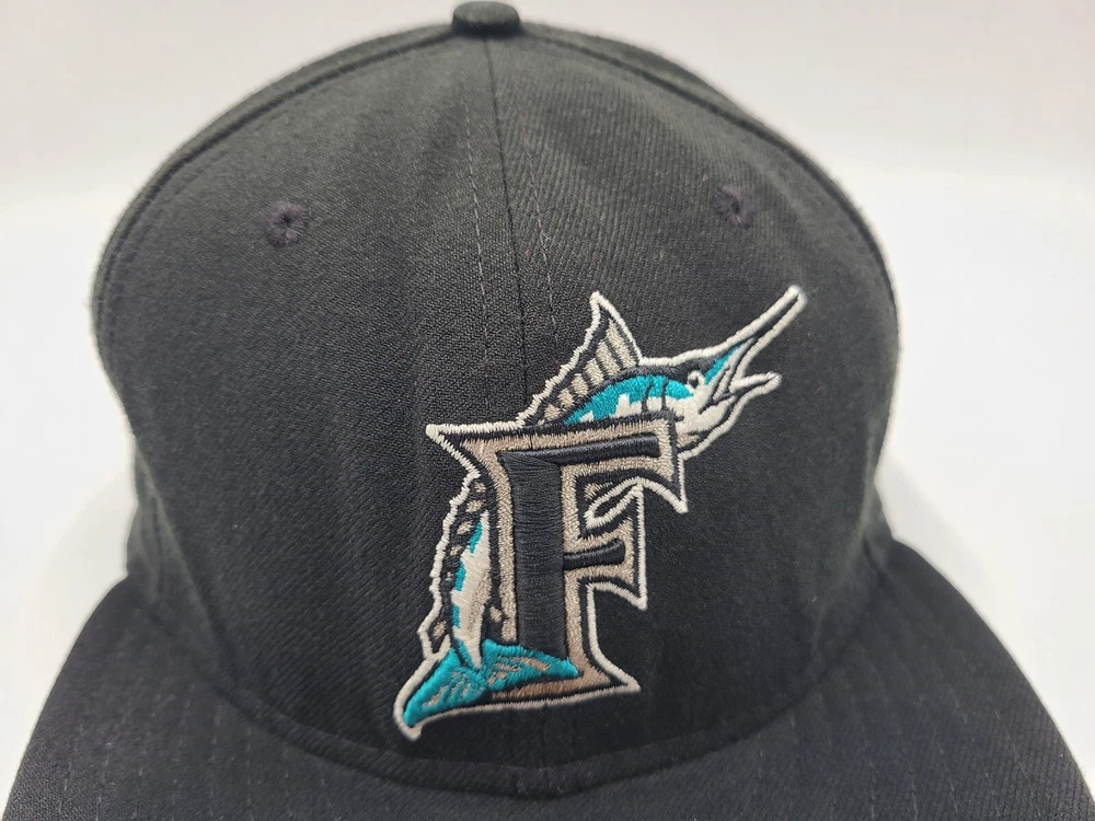 The brim is slightly misshapen as seen in photos. Also has a mark left over from the sticker on the brim and stains underneath the brim. Florida Marlins New Era 59Fifty Fitted 8 Hat Cap Miami Men MLB Baseball Black. EACH ADDITIONAL HAT PURCHASED IS ONLY $1 ADDED SHIPPING!