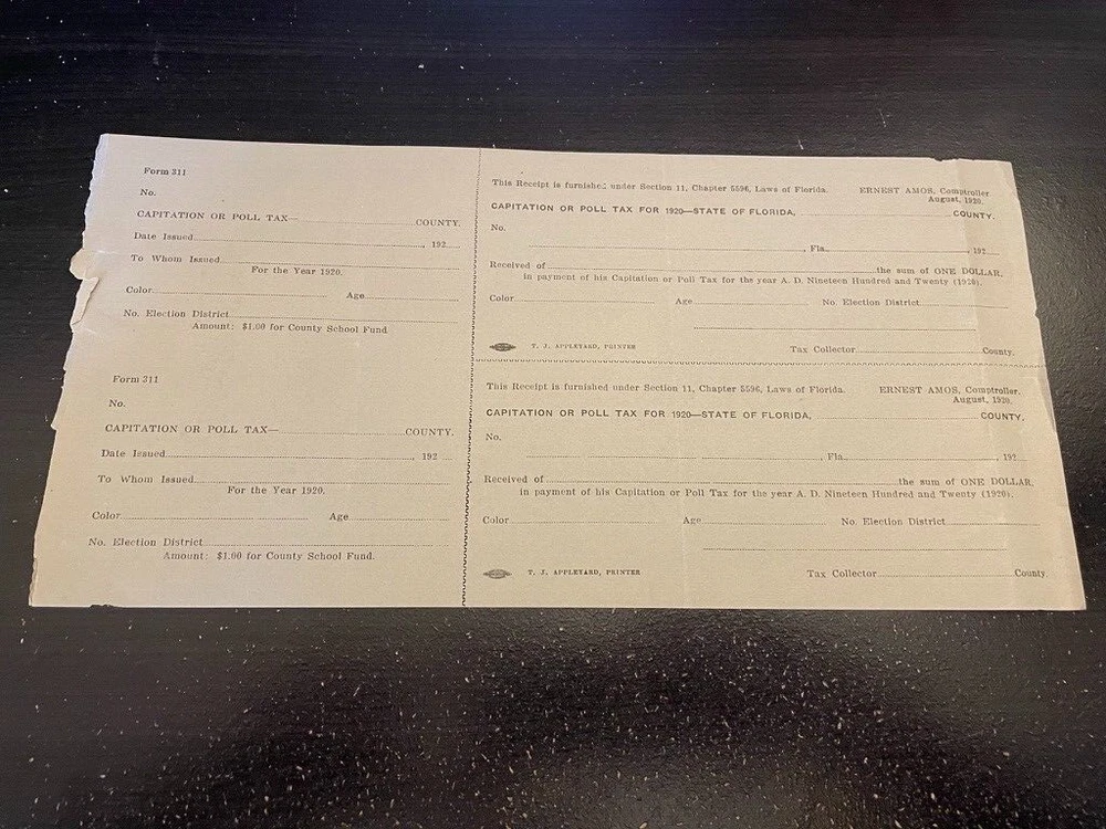 Florida Poll Tax Receipt - Unused - 1920 Election 11-2024 #01 TERMS AND CONDITIONS My name is Stuart Lutz and I am a full time dealer of autographs, letters, documents and historic manuscripts . I am a member of the Manuscript Society, the Professional Autograph Dealers Association, the Antiquarian Booksellers Association of America, the Appraisers Association of America (Certified in the field of Historic Documents), the Universal Autograph Collectors Club (Registered Dealer #166) and the Ephemera Society. I am the historical document appraiser and authenticator for the History Channel program Pawn Stars . If you have any questions, you can call me toll free at 1 (877) 428-9362 . I guarantee the authenticity of this piece forever, and will gladly refund your money if it is ever proven not to be authentic (not many Ebay autograph dealers boast of that!). All items are issued with an invoice that states in writing at the bottom "All autographs and historical papers are guaranteed authentic for life by me. If any piece is ever proven not to be genuine, I will gladly refund the full purchase price to the original buyer." Your piece will be professionally packed and shipped, will be fully insured, and will be sent by trackable USPS mail. I offer interest-free layaway plans, but please contact me or call me toll free at 1 (877) 428-9362 before bidding to notify me that you would like a payment plan. These plans spread out three equal payments over three consecutive months; the first payment is due within seven days of the purchase agreement and is NON-REFUNDABLE for any reason. Full payment is expected within five days, unless other previous arrangements have been made. New Jersey residents, please add 7% for the Governor's salary ;-). Buyers who do not live in the United States must pay using PayPal Best of luck bidding and thanks for your business!
