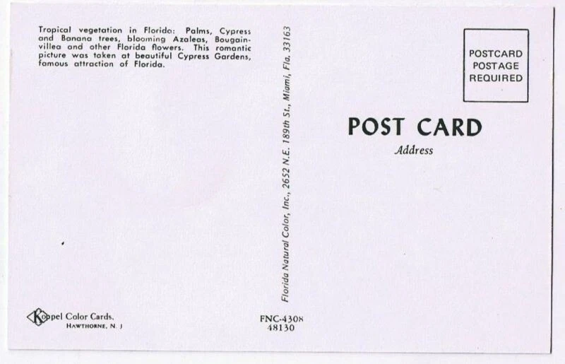 Florida Postcard Winter Haven Cypress Gardens Polk County Florida Postcard Winter Haven Cypress Gardens Polk County Very Good Condition. See scans for minor edgewear (if any). WE ANSWER ALL QUESTIONS WITHIN 2 BUSINESS DAYS. FOR AUCTION ITEMS, PLEASE DO NOT BID UNTIL WE HAVE RESPONDED TO YOUR QUESTION. PLEASE LOOK AT ALL PHOTOS AS THIS IS THE EXACT ITEM YOU ARE BIDDING ON OR PURCHASING. EXPECT ITEMS TO BE IN NORMAL VINTAGE USED CONDITION. WE TRY TO SPECIFY ALL FLAWS. IF THERE IS A PROBLEM WHEN YOU RECEIVE YOUR ITEM PLEASE CONTACT US BEFORE LEAVING FEEDBACK. INTERNATIONAL BUYERS are responsible for paying all import duty, tax and fees which may be collected by your country when the parcel arrives. To avoid any misunderstanding, we declare the exact purchase price as the value of the goods when completing the customs declaration. We will NOT check the "gift" box or under-declare the value . Listing and template services provided by inkFrog
