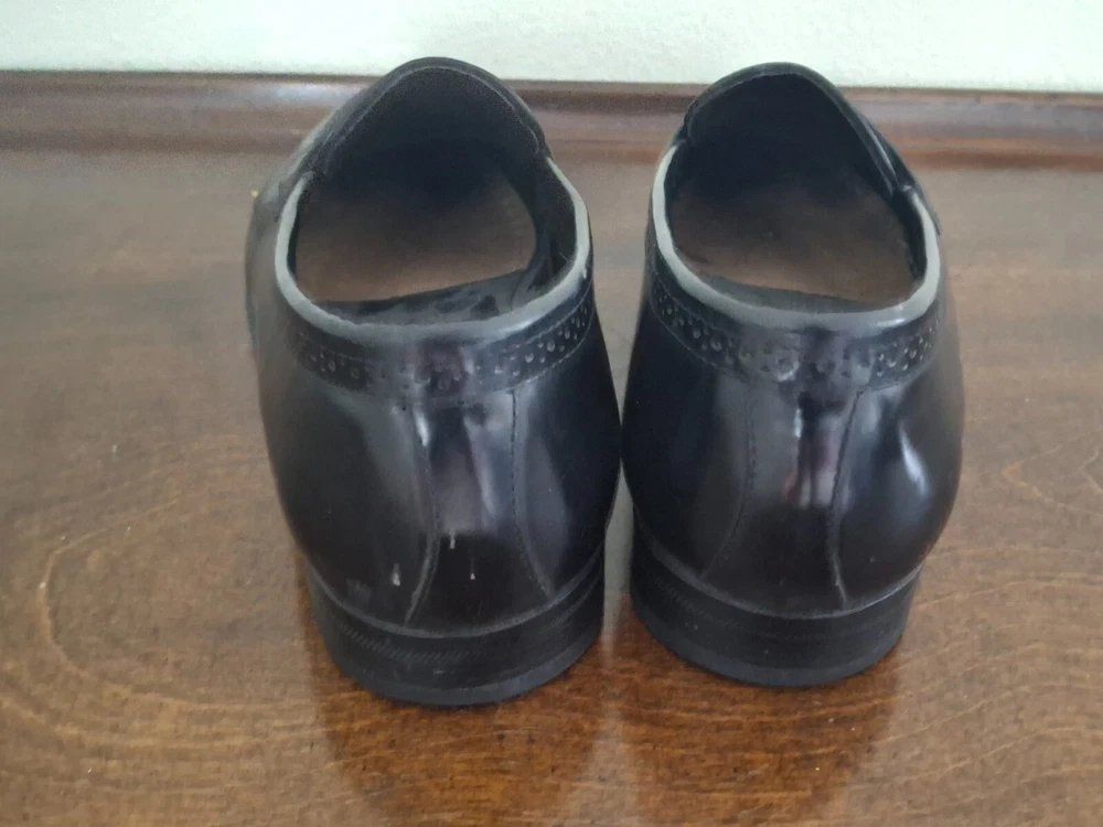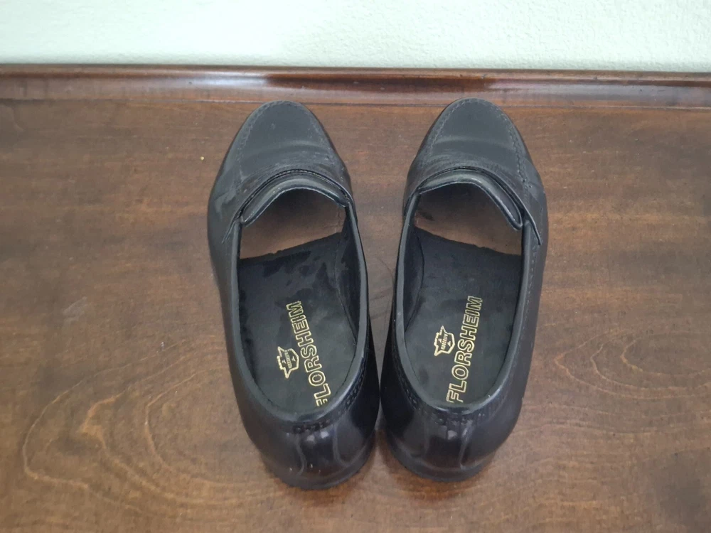Florsheim Black Leather Penny Loafers, Size 9W. There are a few small scuffs from use and obvious use on the soles but the shoes are in Very Good Pre-Owned Condition.