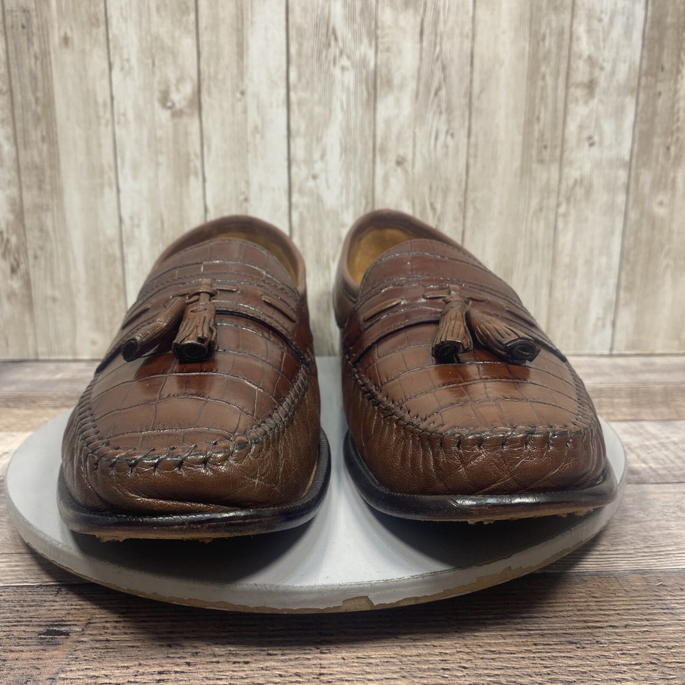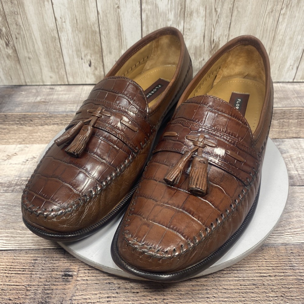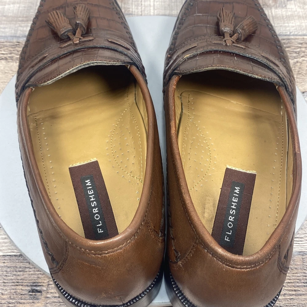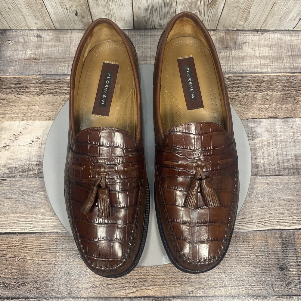 The product is a pair of Florsheim Men's Dress Shoes in Brown Croc Embossed Leather Loafers with Tassel detailing. Good condition. Show some wrinkles. Please check all the pictures.