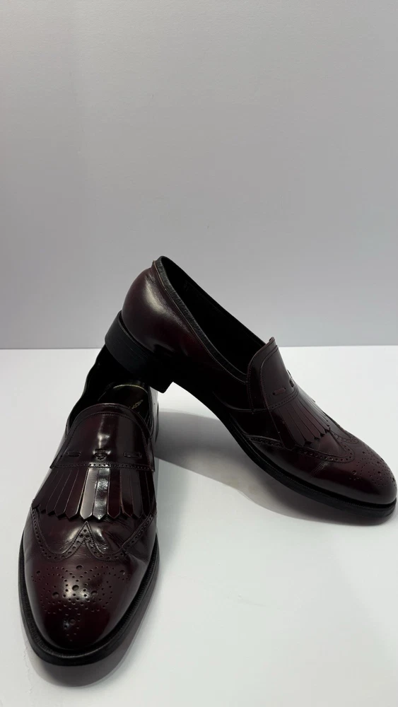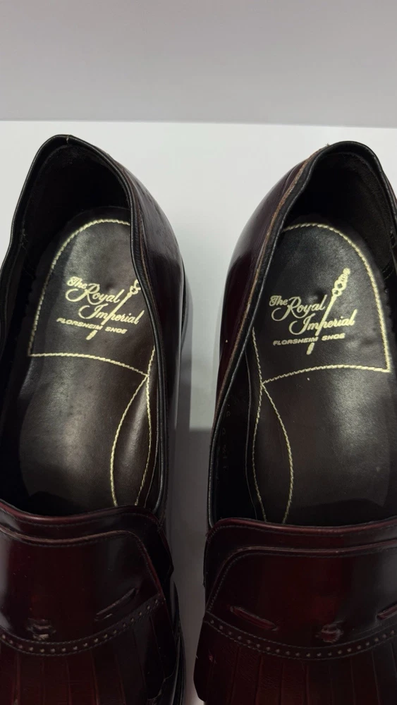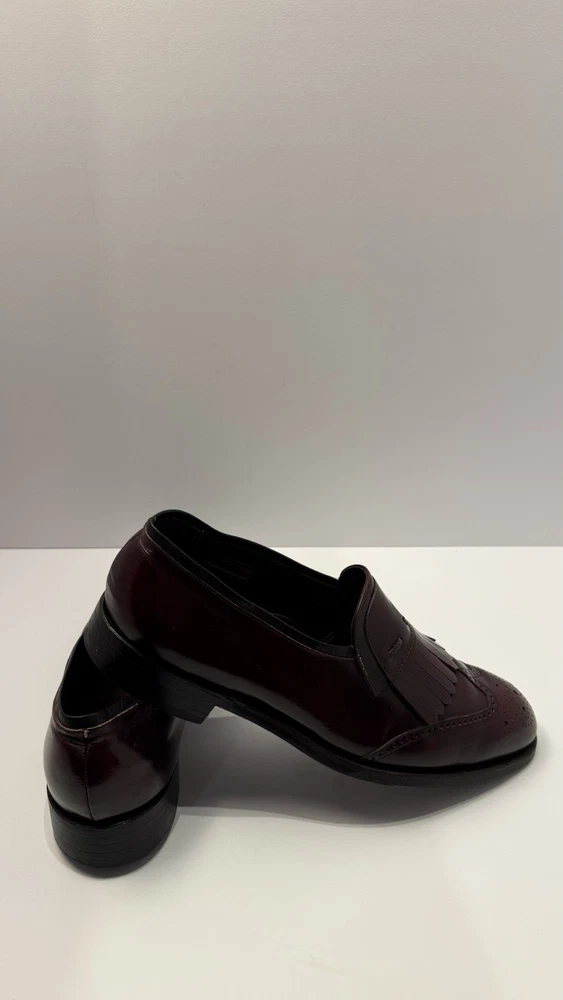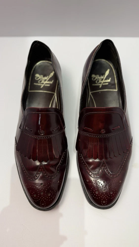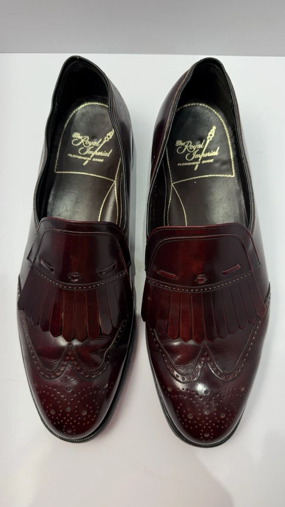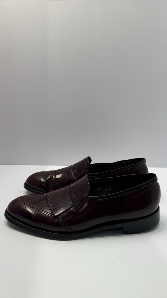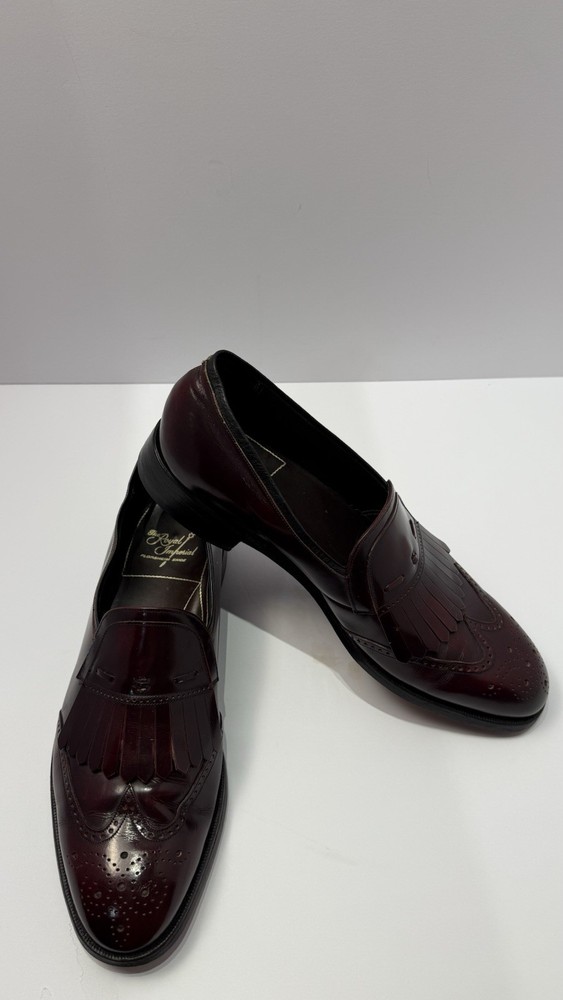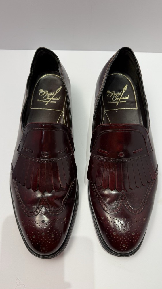Elevate your classic wardrobe with these vintage Florsheim Royal Imperial wingtip loafers in a rich burgundy leather. These shoes feature: • Handcrafted quality made in the USA • Size: Men’s 11 D (Medium width) • Genuine leather upper, lining, and sole • Beautiful brogue detailing and fringed kiltie vamp • Leather outsole with rubber heels (by Vibram) • In excellent vintage condition with minor wear on the soles (see photos) • Model: 317711 23 | Style Code: 97163 JJ Perfect for business, formal occasions, or vintage collectors who appreciate timeless craftsmanship. Rarity: These shoes are part of Florsheim’s Royal Imperial line, known for their premium materials and construction quality.