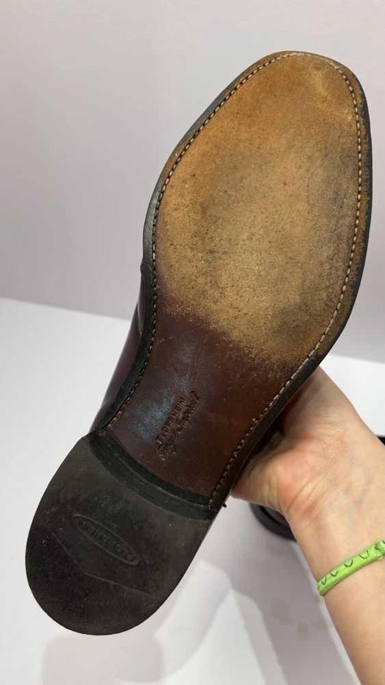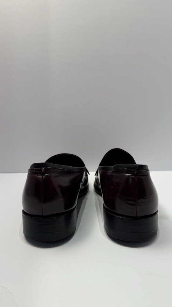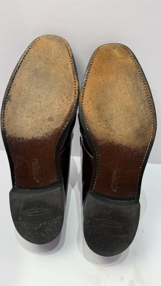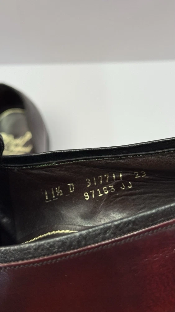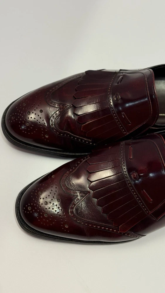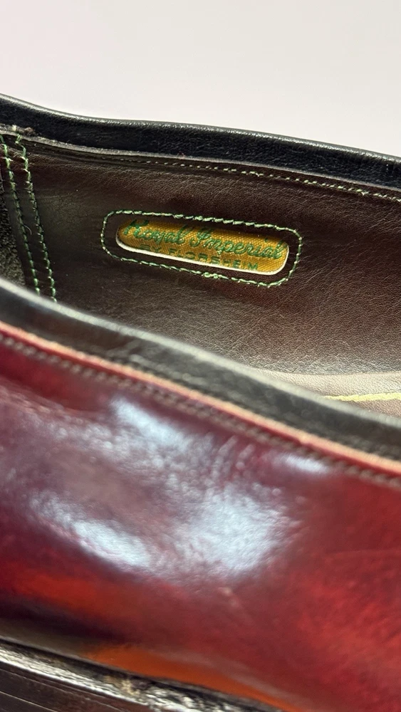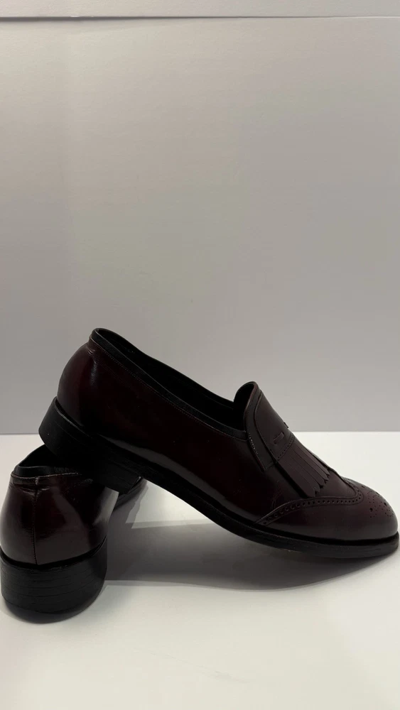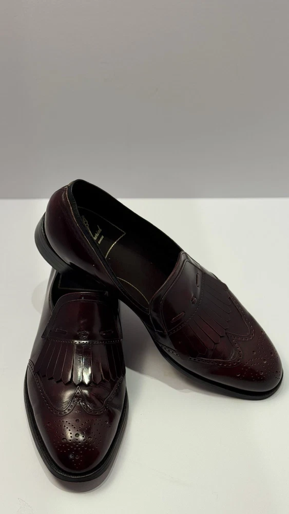 Elevate your classic wardrobe with these vintage Florsheim Royal Imperial wingtip loafers in a rich burgundy leather. These shoes feature: • Handcrafted quality made in the USA • Size: Men’s 11 D (Medium width) • Genuine leather upper, lining, and sole • Beautiful brogue detailing and fringed kiltie vamp • Leather outsole with rubber heels (by Vibram) • In excellent vintage condition with minor wear on the soles (see photos) • Model: 317711 23 | Style Code: 97163 JJ Perfect for business, formal occasions, or vintage collectors who appreciate timeless craftsmanship. Rarity: These shoes are part of Florsheim’s Royal Imperial line, known for their premium materials and construction quality.