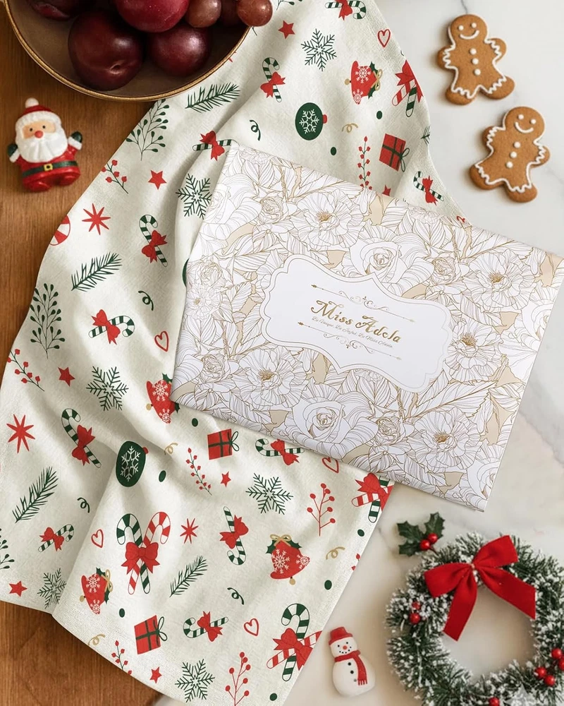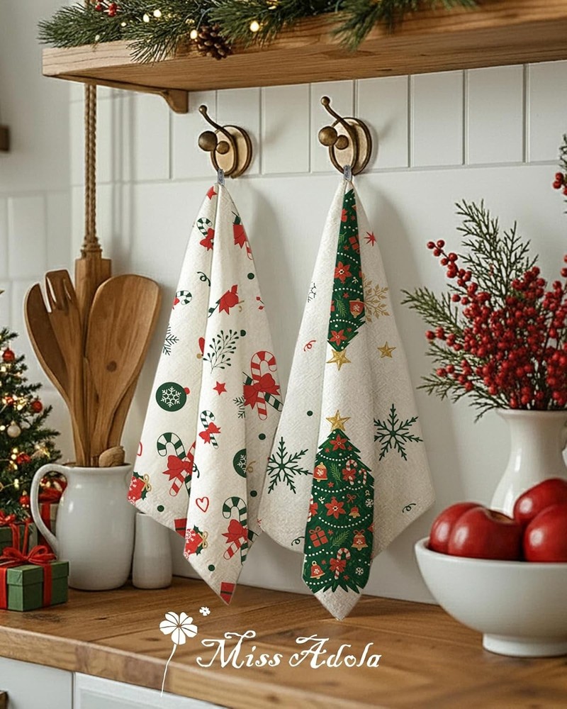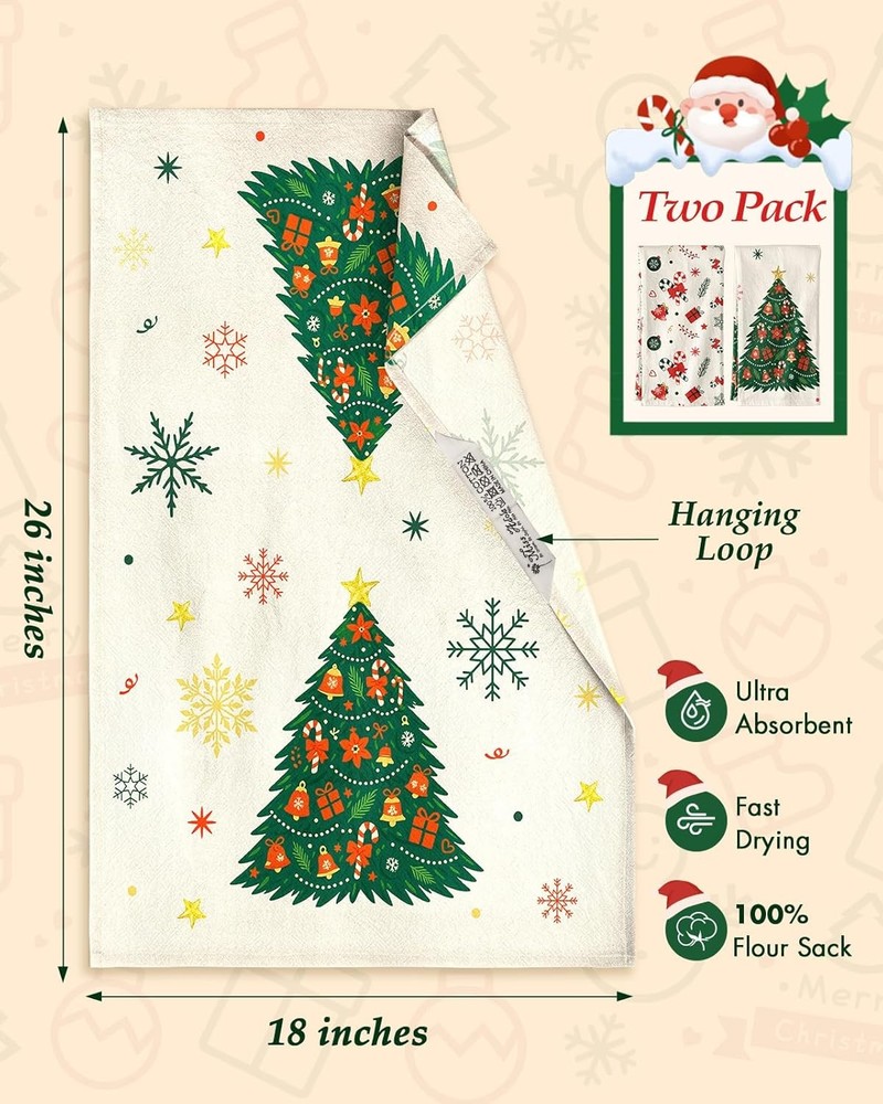 Flour Sack Christmas Kitchen Towels - 18x26 inches, Tree LuxeFusion Product Description Features Festive Classic Designs:Adorned with a simple yet sophisticated Christmas tree print on a creamy white background, this towel set adds a touch of understated holiday charm to your kitchen decor Premium Flour Sack: Crafted from 100% natural cotton, these kitchen towels feature a tightly woven, breathable design that delivers excellent absorbency and quick-drying performance. Durable and versatile, they provide a soft yet sturdy texture, making them a reliable choice for a wide range of daily kitchen tasks Non-linting: The low-lint design ensures a clean and residue-free experience when wiping dishes and glassware, promoting better hygiene. Durable and long-lasting, it offers a firmer initial feel with a lighter, thinner texture, becoming softer and more absorbent with each wash for consistently improved performance Versatile: Featuring an elegant and timeless design, these flour sack towels are perfect for creative uses beyond the kitchen. During the Christmas season, they make beautiful, non-disposable gift wraps. They can also be folded into heat-resistant pads or coasters, or used as breathable cloths for baking and dough proofing. Practicality meets style for endless possibilities Perfect Gift Choice: Stylish and practical, these kitchen towels are a thoughtful and versatile gift for various occasions. Whether it’s a housewarming, a warm gathering at a new home, a festive Christmas gift, or simply a way to show someone you care, these towels combine elegance and utility, making them a meaningful and lasting choice Product Details Color: Christmas Tree Brand: Miss Adola Towel form type: Kitchen Cloth Material: Cotton Product Dimensions: 26"L x 18"W Number of Items: 2 Style: Christmas Tree Pattern: Christmas Tree Special Feature: Fade Resistant, Hanging Loop, Long Lasting, Odor Resistant, Quick Dry Theme: Holiday Product Care Instructions: Machine Wash Shape: Rectangular Size: 18x26 inches Unit Count: 2.0 Count Fabric Type: Flour Sack Occasion: Christmas Manufacturer: Miss Adola Item Weight: 5.9 ounces Free Shipping All orders ship free and fast to your doorstep. Easy Returns Satisfaction guaranteed. 30-day returns, no questions asked. 24/7 Support Contact us anytime; we’re here to help, day or night. Brought to you by LuxeFusion – Quality you can trust.