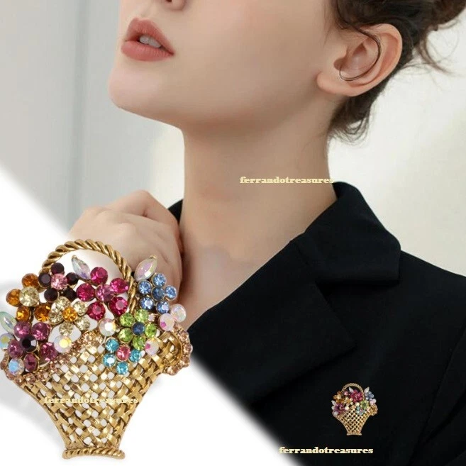 Flower Basket Crystal Rhinestone Vintage Style Brooch Pin and Gold Bag Beautifully Detailed Crystal Rhinestone Flowers with many colors (flower patterns may differ slightly) Brooch is 2 " x 1 3/4 " Free Gold Foil and Cloth Bag Come see all of our other Brooches, Bracelets, Earrings, Necklaces, Pendants, , Rings, and Glow in the Dark jewelry today.