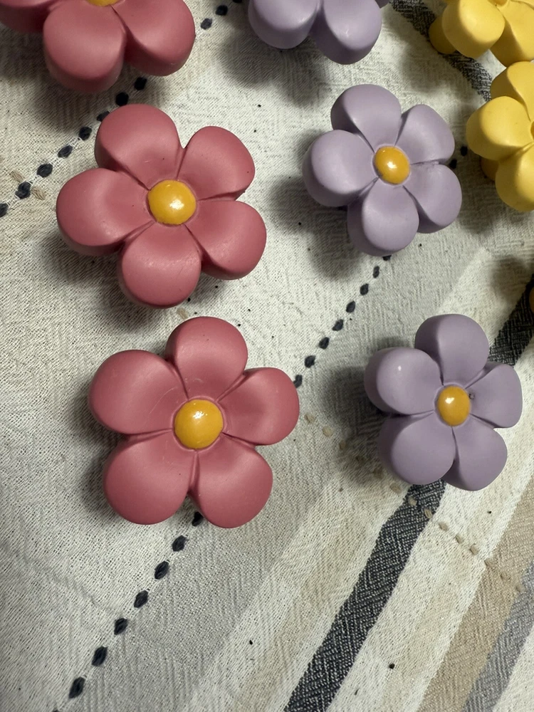 The Flower Drawer Pulls Knobs Handles are a set of contemporary ceramic drawer pulls designed in purple, yellow, and pink colors. They come in a pack of 1 and are suitable for use on bi-fold doors, drawer dressers, and other furniture pieces. These unique and decorative pulls add a touch of style and flair to any room in your home, making them a perfect choice for those looking to enhance their furniture decor with a pop of color.