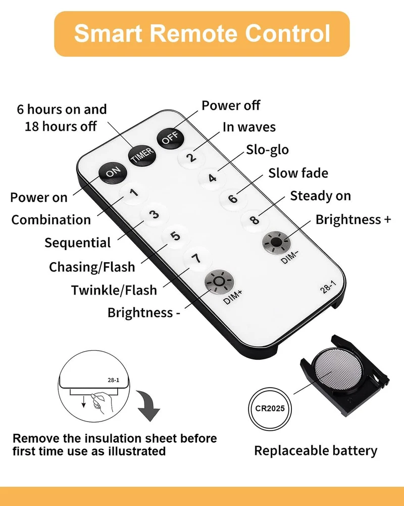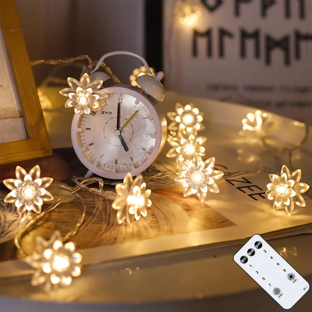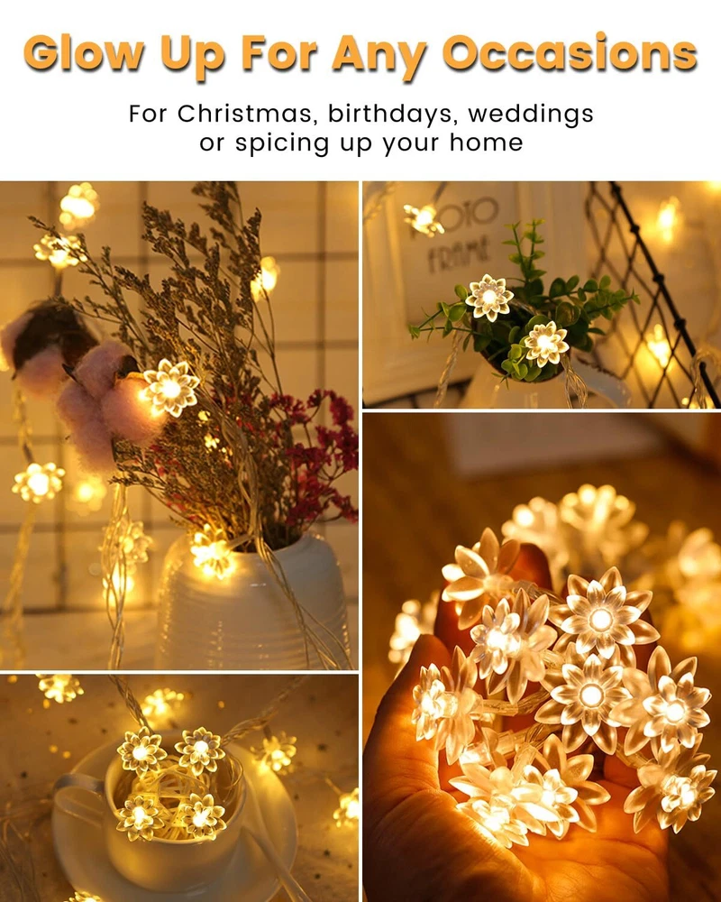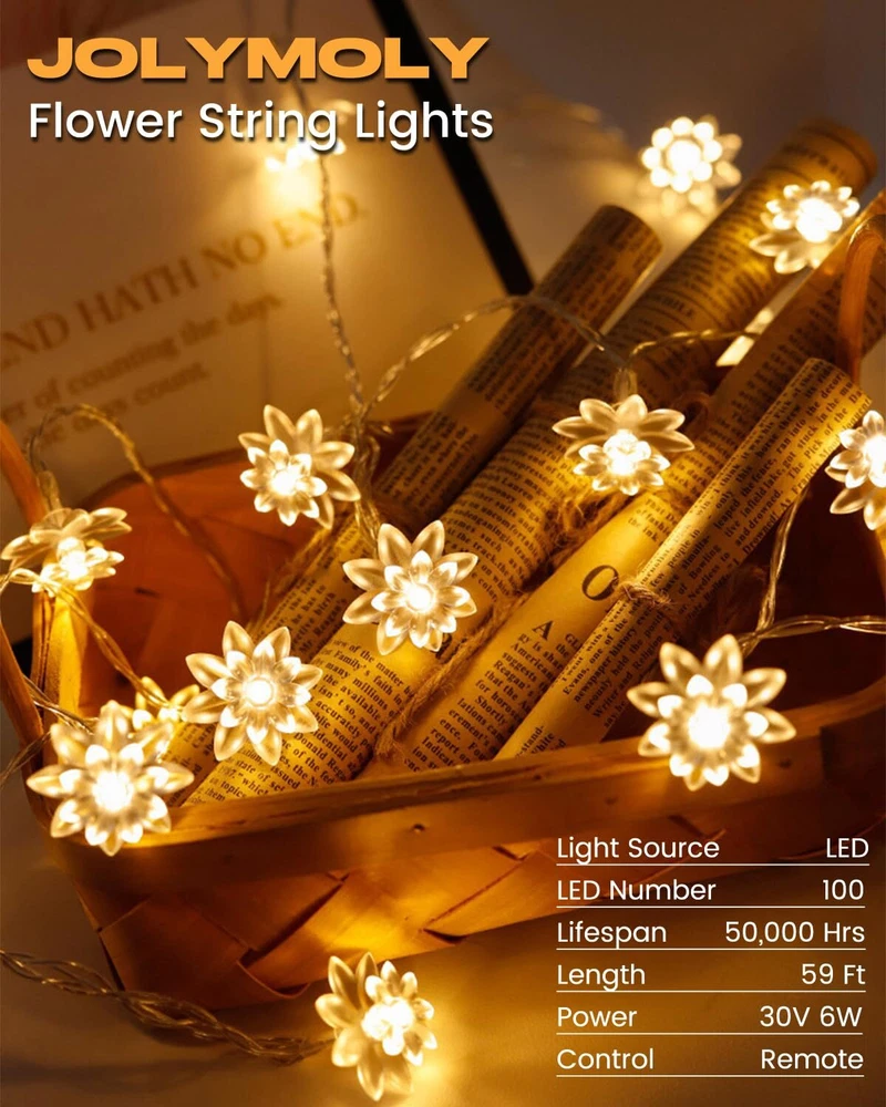 💡Commercial Grade String Lights – Receive a dreamy LED light string with 100 crystal-clear flowers. Quality LED beads cast a cozy glow of 2500 Kelvin and last for over 50,000 hours. Flowers made of enhanced PC plastic are durable and securely fixed to the bulbs. The ETL-certified transformer and wire ensure safety and hours of operation without generating heat. 59 ft total length, including 49 ft lights and 10 ft lead wire. The flower diameter is 1.26 in. Bulb spacing is 5.9 in. ✨Rich Function & Effortless Control – Flower fairy lights with 8 modes including combination, waves, sequential, slo-glo, chasing, slow fade, twinkle, and steady on to suit your mood. Come with a 13-key remote that integrates a timer and dimmer. You can set 6 hours on and 18 hours off or adjust the brightness to 25%/50%/75%/100% using the remote. Twinkle lights will memorize your last setting even if unplug the power. 💫Waterproof & Easy Installation − These plug-in fairy lights rate IP44 dustproof and waterproof, suitable for both indoor and outdoor use. Lights are plug-and-play and extendable with an end-to-end connector. Lights string is well packed to prevent tangling, and easy to install with cable ties, clips, cup hooks, or grippers. 10 ft lead wire solves the wiring issue and ensures you a smooth and enjoyable lighting experience. 🎇Versatile Application − Whether you're adding a warm glow to a special occasion, improving your home's atmosphere, or getting creative with crafts, these cute lights are your go-to solution for a touch of magic in any setting. These ambiance light strings go beyond bedroom and Christmas decor. They're perfect for outdoor gatherings, patio enhancement, wedding decorations, DIY crafts, and so much more. 🤩Customer Service & Warranty − Each string lights come with 2 spare flowers. We also provide a 12-month warranty and extra spare parts at no cost, so you won't pay extra money for any protection plan. Should you have any problem with your products, don't hesitate to contact our customer service. Our support team will be in touch within 24 hours with a proper solution.