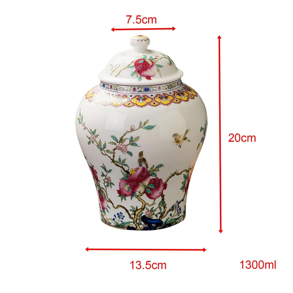 Description: 【Chinese Style】Ceramic ginger jar with chinese traditional pattern, delicate glaze, it makes your room decoration look more elegant. 【Ceramic Material】Tea Storage Jar comes , painted exquisite. Smooth surface and elegant color. 5.31'' in diameter,7.87'' in height. 【With Airtight Lid】Porcelain Tea Canister with lid, used as a tea canister or jars for nuts, coffee beans, snacks, tea jars or decorative vases. 【Applications】Loose Tea Container is suitable for all various occasions like office, meeting room, bedroom, parties, nice gift for warm house, farmhouse, wedding, birthday etc 【Centerpiece Table Decoration】The ceramic food storage container is suitable for decorating of shelf, entrance,coffee table, centerpiece, farmhouse. Specification: Material: Ceramic Capacity: 1300ml Size Chart: Width: 13.5cm/5.31inch height: 20cm/7.87inch mouth:7.5cm/2.95inch Package Includes: 1 Porcelain Tea Canister Note: Please allow slightly errors due to manual measurement and different monitors.