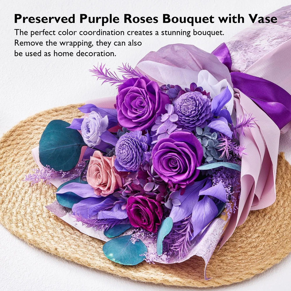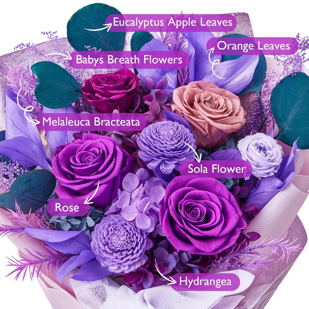 Big Size, Big Charm: Our flowers bouquets, with their large size (16.2"*5.5") and charm, make every gift-giving moment unforgettable.The preserved flowers are cut fresh and treated with unique preservation technology, keeping them fresh appearance and tactile impression at least 1 year. Handmade Roses Bouquets & Long Lasting: This roses bouquets are beautifully handcrafted from 4 purple and 1 dusty pink roses decorated with different colors hydrangeas, artemisia japonica, melaleuca bracteata, orange leaves. Unlike fresh flowers, preserved flowers do not wilt or fade over time. Gifts for Her or Home Decorations: Suitable as gift for Valentine's Day, Mother's Day Anniversary, Birthday or more. They are also suitable for home, bedroom, dining table decoration. Our preserved bouquets will surely brighten anyone's day! Exquisite Packaging: Our gift box is meticulously designed and can be presented directly as a gift without the need for additional packaging. After removing the bouquet, it can be used as a floral arrangement at home, adding beauty to the space. Zero maintenance Care: Our roses bouquet hold beauty and a natural and fresh look, with no maintenance required. Please keep flower bouquet away from humid and high temperature environments, avoid direct sunlight.