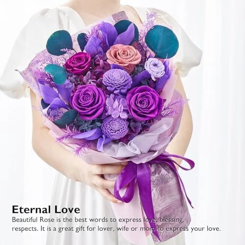 Return Policy Fast Delivery Trusted seller Flowers for Delivery Prime, Preserved Flowers Bouquet for Valentine's Day, Purple Roses and Flowers Bouquet Gifts for Her Women Wife Mom Grandma Birthday Mother's Day Anniversary Product Description Big Size, Big Charm: Our flowers bouquets, with their large size (16.2"*5.5") and charm, make every gift-giving moment unforgettable.The preserved flowers are cut fresh and treated with unique preservation technology, keeping them fresh appearance and tactile impression at least 1 year. Handmade Roses Bouquets & Long Lasting: This roses bouquets are beautifully handcrafted from 4 purple and 1 dusty pink roses decorated with different colors hydrangeas, artemisia japonica, melaleuca bracteata, orange leaves. Unlike fresh flowers, preserved flowers do not wilt or fade over time. Gifts for Her or Home Decorations: Suitable as gift for Valentine's Day, Mother's Day Anniversary, Birthday or more. They are also suitable for home, bedroom, dining table decoration. Our preserved bouquets will surely brighten anyone's day! Exquisite Packaging: Our gift box is meticulously designed and can be presented directly as a gift without the need for additional packaging. After removing the bouquet, it can be used as a floral arrangement at home, adding beauty to the space. Zero maintenance Care: Our roses bouquet hold beauty and a natural and fresh look, with no maintenance required. Please keep flower bouquet away from humid and high temperature environments, avoid direct sunlight. Shipping Returns Payment Shipping Shipping is FREE to all addresses other than APO/PO boxes in the lower 48 states. All our stock ships from US-based warehouses. Shipped via USPS or UPS (depending on location and package weight) Unless stated otherwise, all orders will ship within 24-72 hours of your payment being processed. Check our feedback to see the great reviews of FAST shipping we offer. Returns Seller does not accept returns Payment We currently accept payment via eBay managed payments only. Once payment is cleared, we will dispatch your shipment within 1-3 business days. Please refer to the "Shipping" tab for more information regarding shipping speed to your destination.