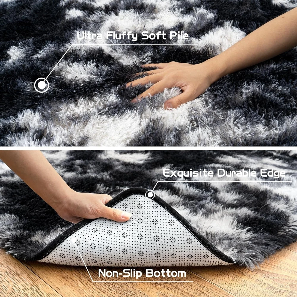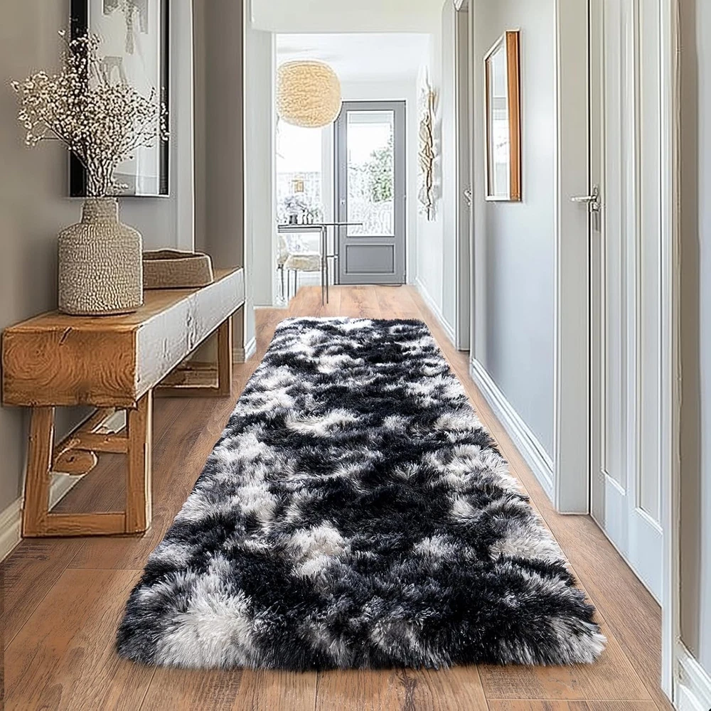 Fluffy Runner Rugs for Bedroom 2' x 6' (Rectangular), Black White Product Details Brand: Pionblank Size: 2' x 6' (Rectangular) Material: front-100% polyester, Back-PVC+Memory sponge Weave Type: Machine Made Pile Height: High Pile Construction Type: Machine Made Back Material Type: Sponge Color: Black White Indoor/Outdoor Usage: Indoor Is Stain Resistant: No Shape: Rectangular Product Dimensions: 72"L x 24"W Rug Form Type: Runner Water Resistance Level: Not Water Resistant Item Weight: 1.79 pounds Manufacturer: Pionblank Country of Origin: China Soft Material: Pionblank runner living room rugs are crafted from front polyester, back pvc and memory sponge interlayer that provide a luxuriously soft and cozy feel underfoot, adding a touch of comfort and warmth to any space Anti-Slip Properties: Pionblank 2x6 feet shaggy runner bedroom rug is designed with non-slip latex particle backing which can hold the floor more firmly, which make the shag rug more ideal for kids and pets to play on Versatile Usage Scenarios: Whether you want to enhance the comfort of your living room, create a cozy atmosphere in your bedroom, or add a touch of warm and sweet to your nursery, kids' room, playroom, our Pionblank modern plush area rug is a versatile choice Easy to Clean: Regular vacuuming or shaking off loose dirt is usually sufficient for our Pionblank rug, you also can be wiped with a damp cloth. For deeper cleaning, it can be hand-washed or spot-cleaned, then place it in a ventilated place to air dry, avoid using the dryer Precautions for Use: Avoid placing the rugs on wet or slippery surfaces to maintain the anti-slip properties. The rug is vacuum packed, please lay flat and it will fluff up back in 2-3 days