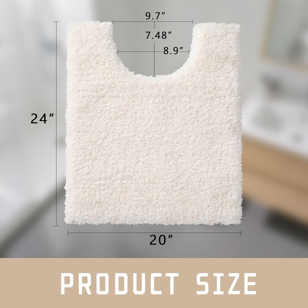 Microfiber [ MULTIPLE MACHINE WASHES WITHOUT CLUMPING OR TANGLING ] Our fluffy U-shaped toilet rugs(24x20 inch) are woven from off white microfiber yarns and will appear slightly different colors in different light and equipment. Unlike other bath mats on the market prone to clumping and tangling, our plush bath rug is crafted from sturdy, reliable materials that ensure long-lasting use. Cleaning is a breeze—whether hand-washing or using a machine, this bath mat emerges looking brand new [ CLOUD-LOFT COMFORT UNDERFOOT ] Our toilet rug measures 20"L×24"W with a 9.7" U-cut opening. For optimal fit, please match your toilet base dimensions with our reference Image #4 before purchase. The 1.37-inch plush pile cradles feet in ultra-dense microfiber luxury—thicker and plusher than standard mats—delivering lasting pillow-soft comfort. High-resilience fibers maintain their fresh appearance and plush feel through repeated use. Indulge in therapeutic softness during your private moments [ ULTRA-ABSORBENT and QUICK-DRYING ] Our plush U-shaped toilet rugs for the bathroom showcase a dense pile of absorbent fibers that effortlessly soak up water. Step onto the mat with confidence right after your shower, preventing any water from being tracked onto your bathroom floor. The high-density material excels not only in moisture absorption but also in providing a cushioned haven for your feet, ensuring warmth and coziness even on the coldest tiles [ PATENTED NON-SLIP TPR BOTTOM FOR ENHANCED SAFETY ] Our U-shaped toilet rug featuring a patented hexagon suction cup-inspired bottom design that firmly anchors the mat in place. This ingenious structure effectively prevents water from seeping through, adding an extra layer of security for both you and your loved ones. Engage in your bathroom activities with peace of mind, knowing you are safeguarded against slips and falls [ VERSATILE USAGE SCENARIOS ] Our luxury shaggy microfiber U-shaped toilet rugs effortlessly harmonize with various bathroom settings. With an array of colors and sizes to choose from, you can find the perfect fit for your decor. Enhance your shower, bathtub, master bathroom, kids' bathroom, or vanity area with these rugs. Their warm and cozy surface invites relaxation, transforming your bathroom into an oasis of comfort and style