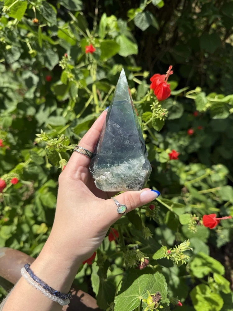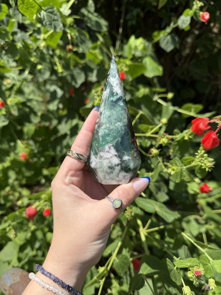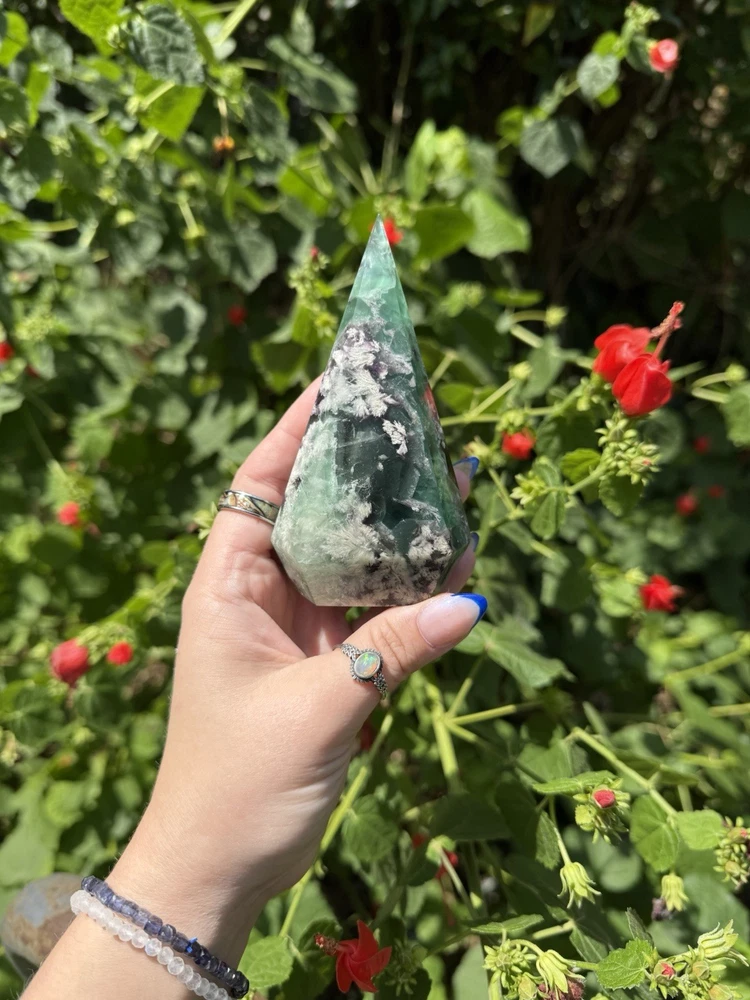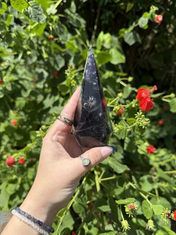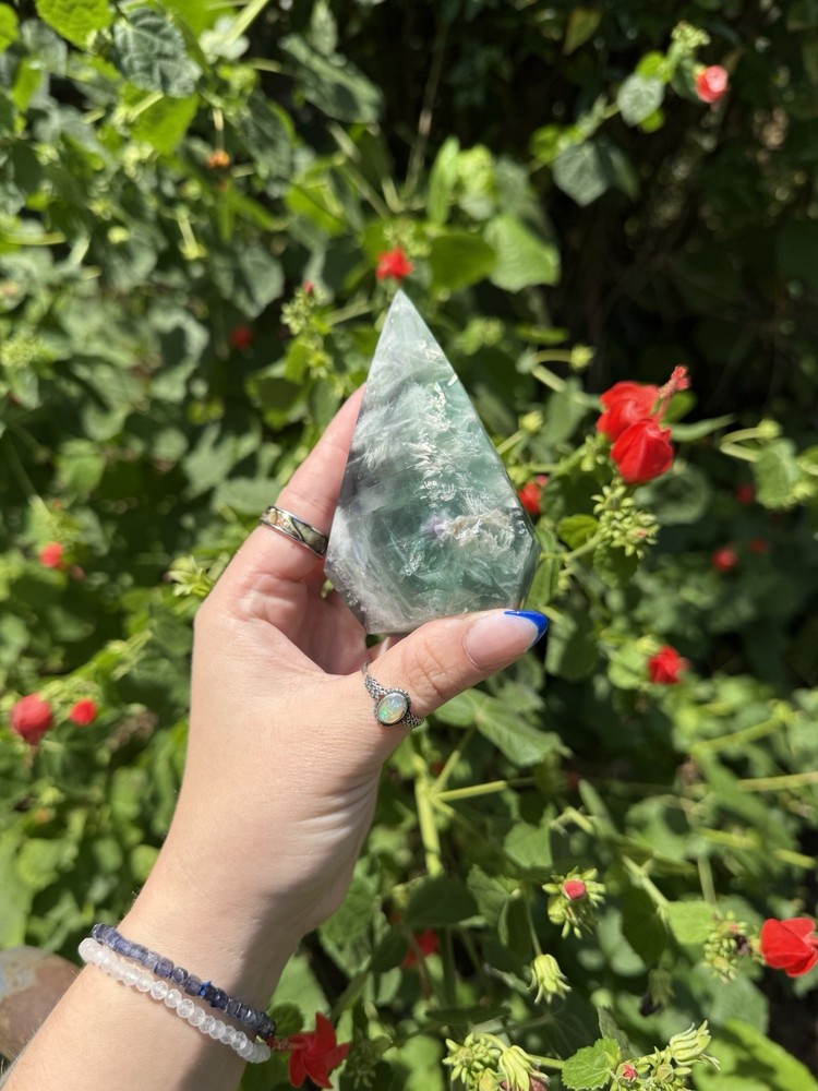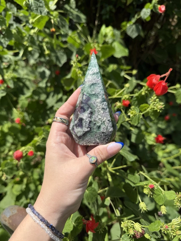 Listing is for one (1) Fluorite Diamond carving. Most have rainbows and natural “druzy” pockets. They weigh between 0.63-0.88lbs. All are intuitively chosen. Renowned for its kaleidoscope of hues, fluorite is a visual feast for the senses. From serene blues and purples to vibrant greens and yellows, each piece of fluorite is a unique work of art, captivating the eye and captivating the soul. As a stone of mental clarity and organization, fluorite serves as a powerful ally in your journey towards productivity and focus. Its gentle yet potent energy clears away mental fog, allowing you to approach tasks with precision and efficiency. With fluorite by your side, you'll experience enhanced concentration, improved decision-making, and a sense of order in the midst of chaos. Fluorite is not only a champion of mental prowess but also a guardian of emotional well-being. Its soothing vibrations gently dissolve negative energies and emotional blockages, creating space for tranquility and inner peace to flourish. By fostering emotional balance and resilience, fluorite helps you navigate life's challenges with grace and self-assurance. Known as the "Genius Stone," fluorite stimulates intellectual growth and promotes the assimilation of information. Whether you're a student, researcher, or simply seeking to expand your knowledge, fluorite amplifies your ability to absorb and retain information. It enhances logical thinking, sharpens your memory, and encourages innovative problem-solving, making it an indispensable tool for learning and personal growth. Beyond its mental and emotional benefits, fluorite is also a potent energy cleanser. Its purifying properties release stagnant energy, rejuvenating your aura and restoring balance to your energetic system. As it clears away negativity, fluorite creates space for positive energy to flow, revitalizing your spirit and enhancing your overall well-being. Immerse yourself in the transformative energy of fluorite and unlock the door to clarity, focus, and inner harmony. Embrace the captivating colors and embrace the wisdom it imparts, as you navigate life's journey with newfound confidence and grace. Discover the mesmerizing allure of fluorite and experience the profound impact it can have on your life, bringing clarity, inspiration, and a renewed zest for living.