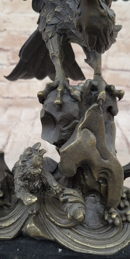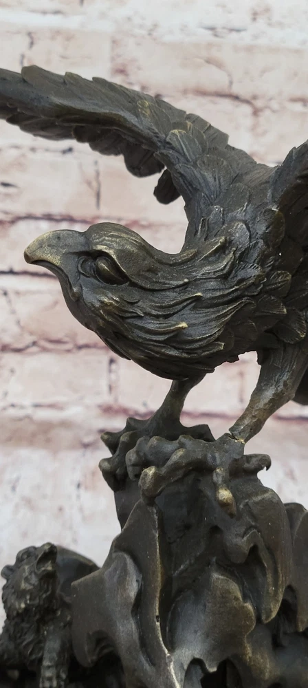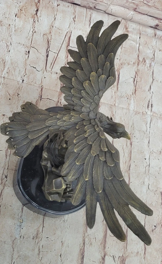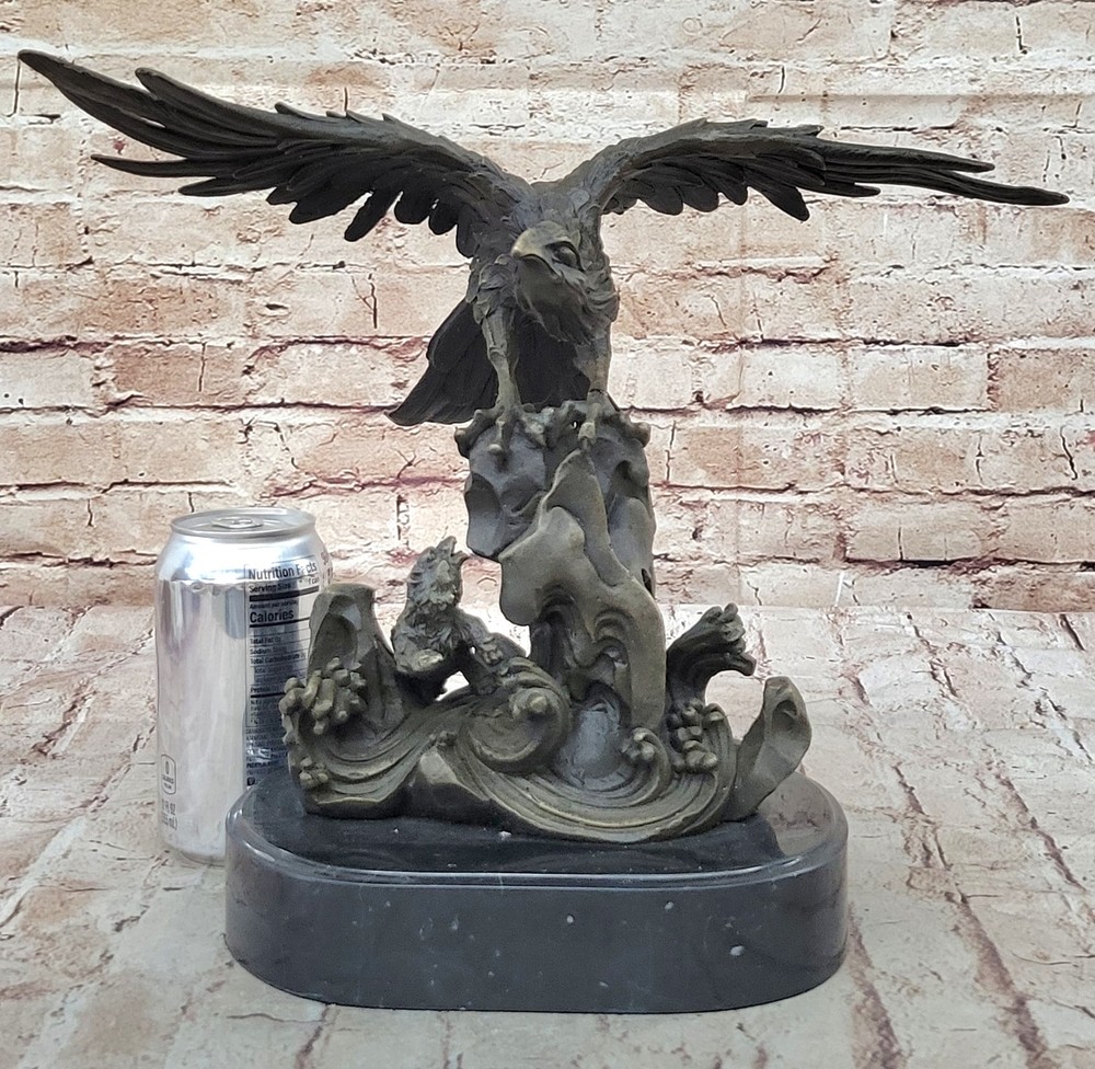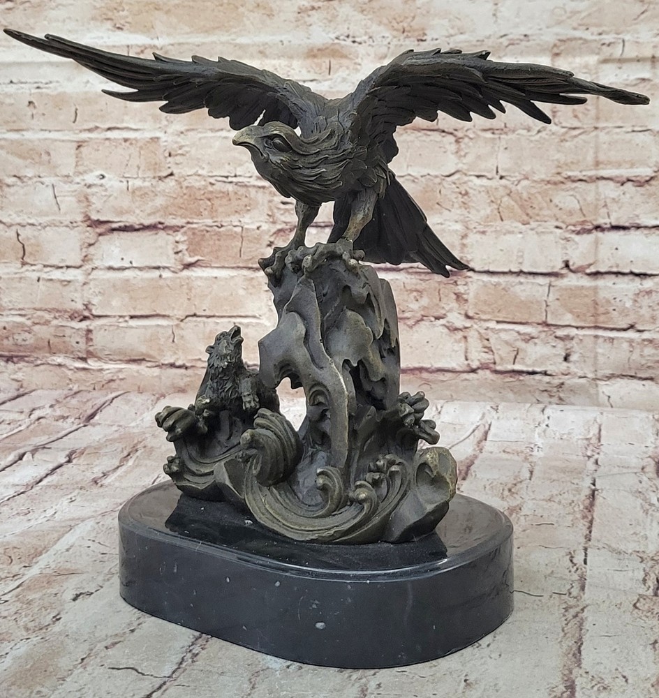 Flying High American Eagle Bronze Sculpture by Milo Bird Art Deco Statue Sale Flying High American Eagle Bronze Sculpture by Milo Bird Art Deco Statue Sale Condition : This sculpture is in perfect condition. Bronze Dimensions with Marble Base: Height 13" X Width 13" Marble Dimensions: Diameter 8" Height without base:12" Weight:15 LBS Inventory:17-Y1095571 Captivating Bronze Sculpture of Bird and Bear This bronze sculpture depicts a bird with its wings open, standing on a fluid-like bronze plinth. The bird appears to be absorbing its surroundings with its eyes closed, exuding a sense of tranquility and connection with nature. Intriguing Composition Adding an intriguing element to the composition, the base features a bear with an open mouth. This unique combination of bird and bear creates a dynamic interplay of serenity and strength, inviting viewers to ponder the relationship between these two creatures. The sculpture was cast using the traditional lost-wax method and finished with a brown patina stain to preserve its beauty. Artistic Masterpiece by Milo Mounted on a circular black marble base, this sculpture stands as a testament to the artist's skill and creativity. It bears the signature of the artist, Milo, ensuring its authenticity and artistic value. This captivating piece is a stunning addition to any collection, blending natural beauty with artistic expression. EAGLE ON WAVES REAL 100% BRONZE STATUE/SCULPTURE/FIGURINE FIGURE ART DECO DECOR Video will open in a new window Using the eBay App? Paste link into a browser window: [isdntekvideo] Shipping Terms : Most of our items are shipped via USPS (United States Postal Service) mail or UPS. Most orders are shipped within 24-48 hours of purchase. Please be aware that not all items are available for USPS shipping due to size and weight. We do ship to Hawaii, Alaska, Canada, Puerto Rico, APO/AE, and U.S. Virgin Islands, however, an additional charge may be required. Please contact us before making any purchases in these areas. For Non-USA customers, you may be responsible for all duty, tax, brokerage fees that may be due upon delivery (shipping costs cover freight charges only). We also ship internationally. Please refer to the "Shipping and Handling" chart for the rates for each area. Payment : We accept just about any form of payment. PayPal, Master Card, Visa or American Express credit cards. Money orders, cashiers checks, and even personal or business checks. For governmental institutions, we will also accept a purchase order. Please understand that for personal or business checks we have to wait for the check to clear (usually 7 days) before shipping. Condition : New Detailed Hand Crafted Hot Cast Bronze Satisfaction Guaranteed. This is Stock Photo, Slight Color Variation!! Listing and template services provided by inkFrog