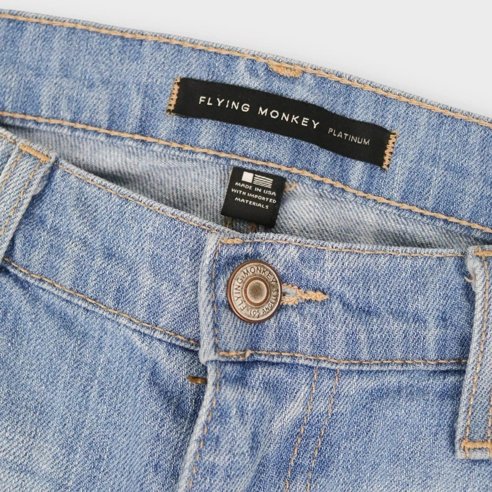 Theme: Casual, Classic, Denim, Distressed Features: Distressed, Easy Care, Pockets, Shaping, Slimming Size Type: Regular Waist Size: 33 in Style: Straight Model: N/A Brand: Flying Monkey Season: Fall, Spring, Summer Personalize: No Rise: Mid (8.5-10.5 in) Fabric Type: Denim Fabric Wash: Light Type: Jeans Product Line: N/A Pattern: Solid Handmade: No Country/Region of Manufacture: United States Pocket Type: 5-Pocket Design Closure: Button, Zip Size: 28 Color: Blue Accents: Button, Zipper Inseam: 28.5 in Material: Cotton Department: Women Fit: Slim Vintage: No Garment Care: Machine Washable