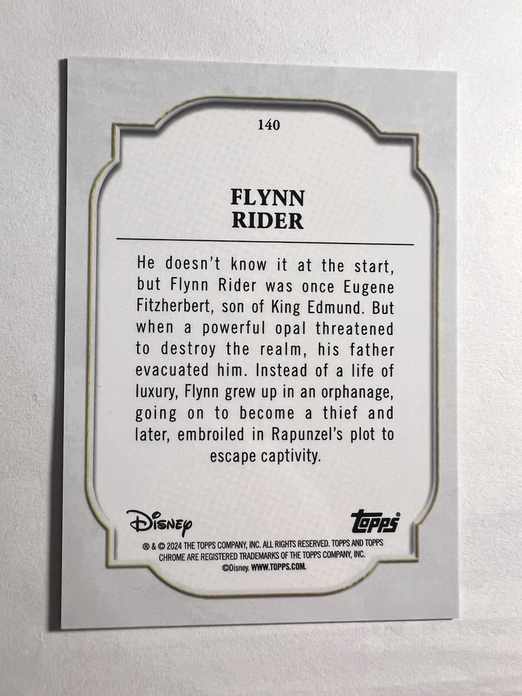 Character: Flynn Rider Type: Non-Sport Trading Card Manufacturer: Topps Franchise: Disney Year Manufactured: 2024 Features: Base Set Card Number: 140 Movie: Tangled Autographed: No Set: 2024 Topps Chrome Disney