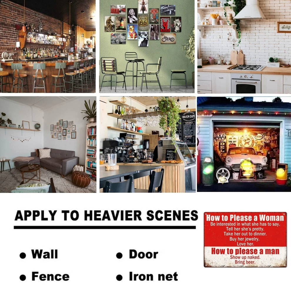 Fmcmly Funny Garage Sign Humor Man Cave Bar Art Decorations, How To Please A Woman And A Man Sign, Vintage Metal Tin Signs Home Kitchen Bedroom Wall Decor 8x12 Inch Product Details Color: Color07 Brand: Fmcmly MPN: xptp101 UPC: Does not apply EAN: Does not apply Color: Color07 Brand: Fmcmly Material: Metal Theme: Words & Quotes Recommended Uses For Product: Wall decoration in various locations such as houses, cafes, kitchens, clubs, offices, bars, restaurants, dormitories, grottos, and garages. See more Mounting Type: Wall Mount Product Dimensions: 12"L x 8"W Shape: Rectangular Style: Durable,Vintage Pre-printed: Fmcmly Funny Garage Sign Humor Man Cave Bar Art Decorations, How To Please A Woman And A Man Sign, Beer, Wine Item Weight: 5 ounces Manufacturer: Fmcmly Country of Origin: China Item model number: xptp101 Size: 8" x 12" (20x30cm). Weight:5.1OZ/145g.These tin signs are made of high quality metal. These eye-catching signs are not easy to bend, harmless, will not rust and fade.It is environmentally friendly and recyclable. SIMPLE HANGING ARTWORK: Light weight, Pre-Drilled holes in 4 corners, It can be easily mounted on every surface. No need for adhesive or special quipment .Plus, The rolled edges and rounded corners keep you safe. Whether you put them in a central location or choose a spot that speaks to your heart, these signs are sure to add personality and style. WIDE RANGE OF APPLICATIOM: These vintage metal signs are not really rusty. It is a fun and attractive decoration for your House, Cafe, Kitchen, Club, Office, Bar, Restaurant, Dormitory, Grotto or Garage! PERFECT GIFT:You can give it to to yourself or someone as a collection or gift, It is a perfect gift for various occasions.You can choose your favorite pattern in our store. HIGH-QUALLITY SERVICE:We provide high-quality after-sale refund and return services. If You Have Any Questions,Please Contact we! you can now click "Add to Cart"! Buy with confidence!
