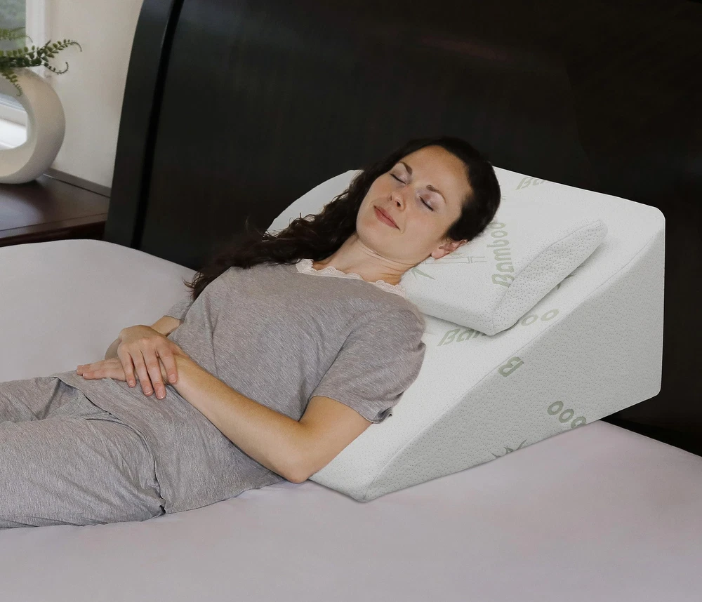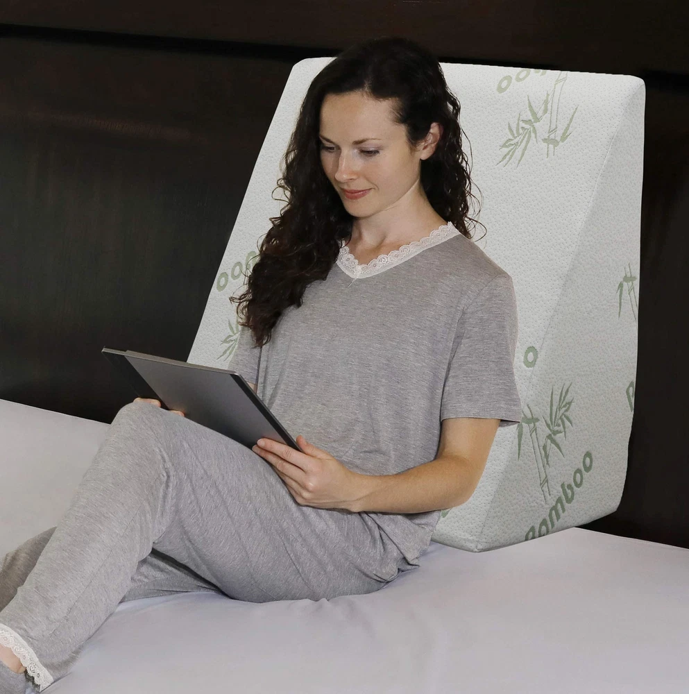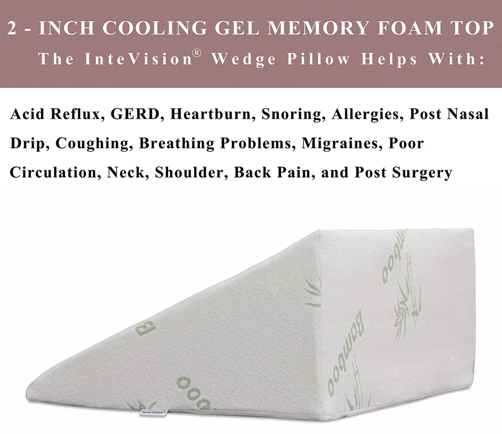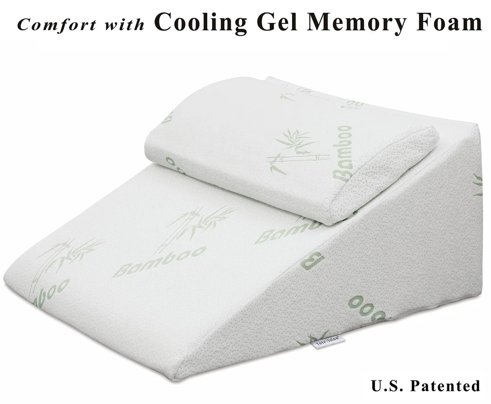 Layer Design plus an adjustable Cooling memory foam headrest pillow in package: This latest version is made of 2-INCH Cooling memory foam layer on top of a firm base foam, also adding a height-adjustable Cooling memory foam headrest to provide better support for your neck and head. The end result is the most comfortable wedge pillow system on the market. U.S. Patented. Designed to help patients with acid reflux, snoring, allergies, or any other condition which breathing may be impaired in supine position. It can also be used when you are recommended by a professional to sleep in an elevated position after surgery. It helps reduce back pain, providing a healthy, more comfortable night's sleep. Comes with a machine-washable, cover (50% Viscose derived from , 50% Polyester). Note: based on the number of people who want to purchase extra pillowcases for this wedge pillow, we have released an optional 400 thread count, 100% Egyptian cotton pillowcase on (sold separately and available on ). Note: this wedge pillow is placed in a vacuum sealed package. It will regain its intended shape after opening the package.