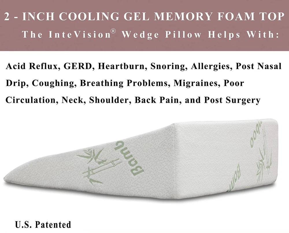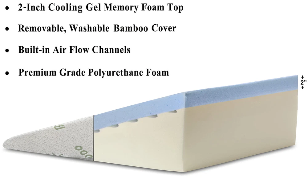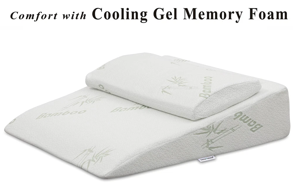 Layer Design with High Quality Cover (50% Viscose derived from , 50% Polyester): This latest version is made of 2-INCH Cooling memory foam layer on top of a firm base foam, also adding a height adjustable Cooling memory foam headrest to provide better support for your neck and head. The end result is the most comfortable wedge pillow system on the market. U.S. Patented. Designed to help patients with acid reflux, snoring, allergies, or any other condition which breathing may be impaired in supine position. It can also be used when you are recommended by a professional to sleep in an elevated position after surgery. It helps reduce back pain, providing a healthy, more comfortable night's sleep. Based on the number of people who want to purchase extra pillowcases for this wedge pillow, we have just released an optional 400 thread count, 100% Egyptian cotton pillowcase on (sold separately and available on )