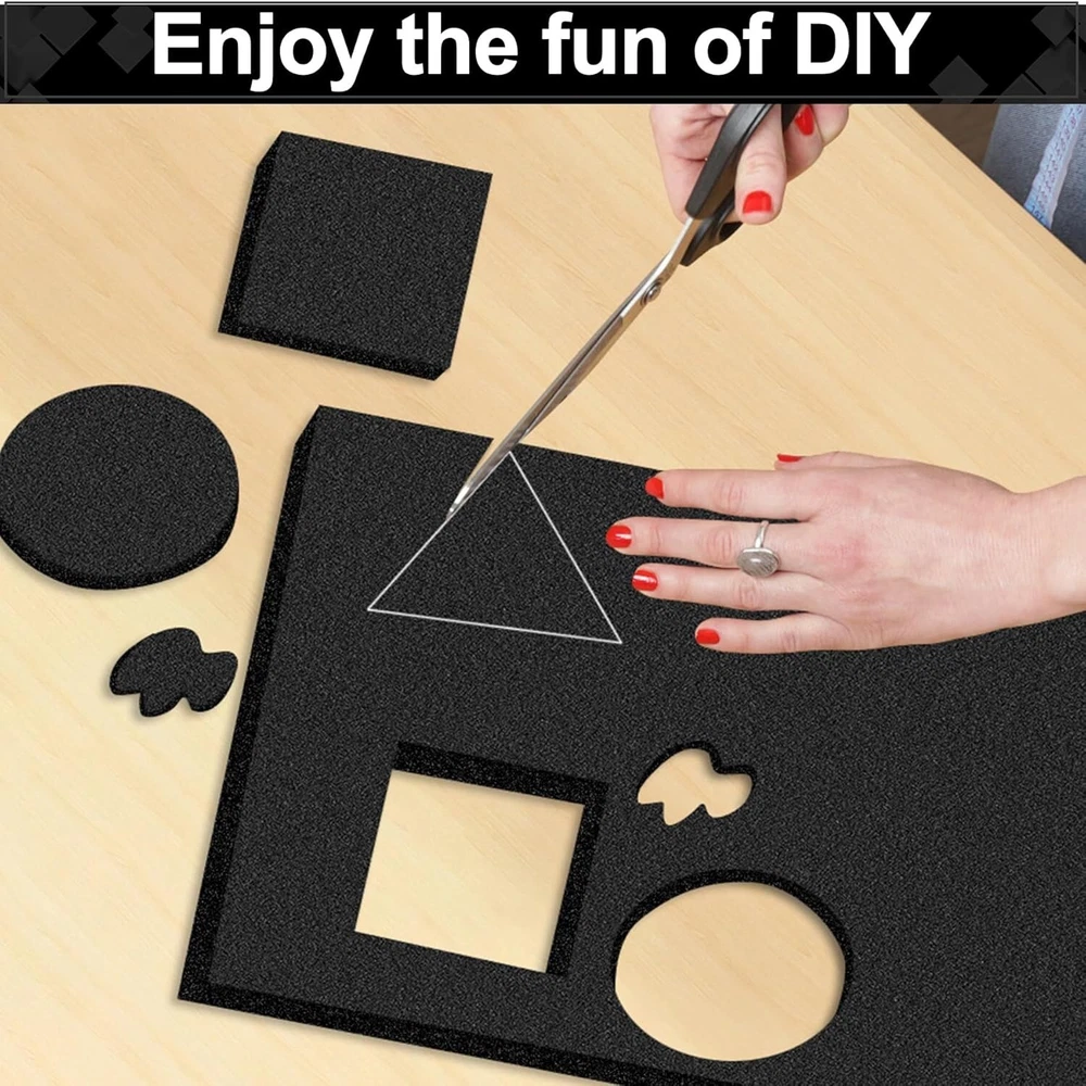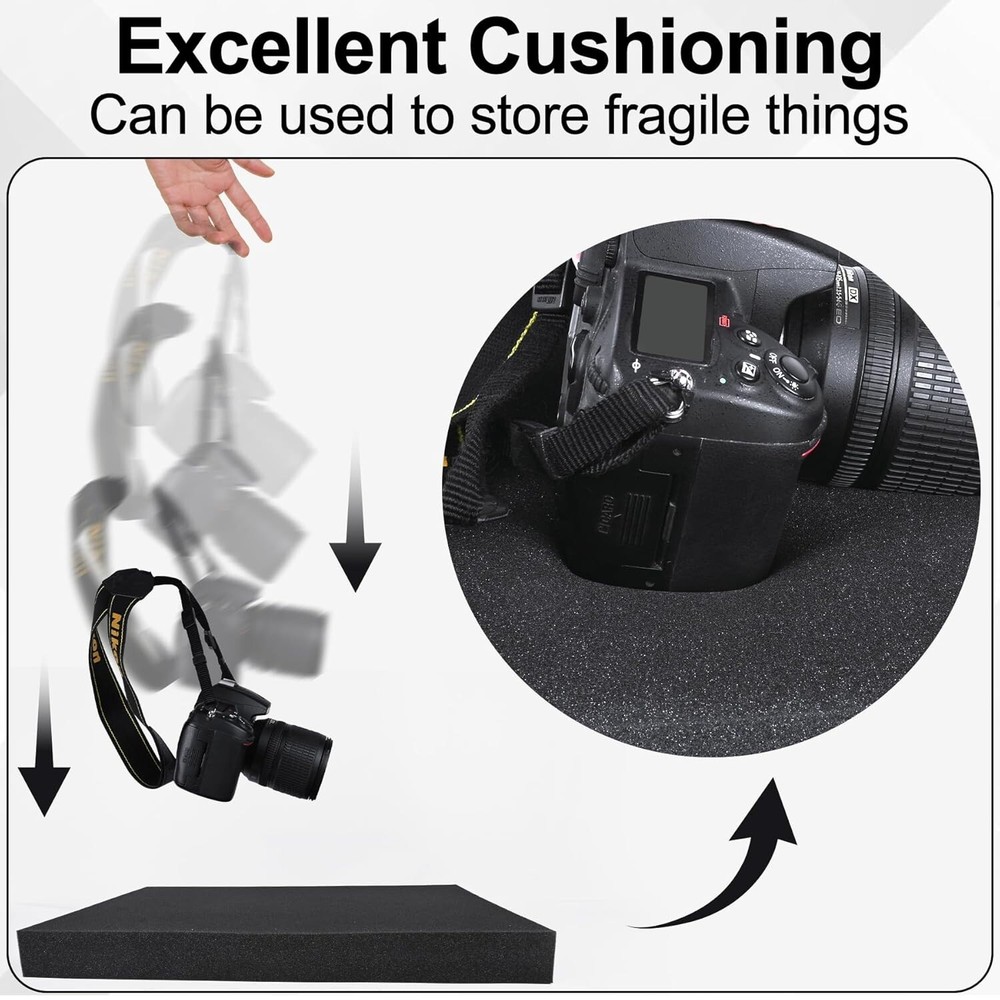 Foam Sheets Tool Box Case Foam Inserts Mat Toolbox Game Box Craft Camera Storage Size: 16 x 12 x 1 IN Number of Items: 8 Material Polyurethane Product Dimensions 16"L x 12"W Color black Item Weight 1.7 Pounds 【Quality Material】Tool box foam sheets are made of high density polyurethane material, light weight, soft and reliable. With high resilience and cushioning, case foam paddings are a good protective layer for valuables and fragile things. Durable material, no deformation and tear resistant, good choice for long term using. 【Multi Function】Polyurethane foam sheets are soundproof and shock absorbing. Case foam can avoid fragile things like electronics, tableware, china, and cameras from breaking during transportation. Drawer foam can also be used for toolboxes to make it neat and without mess. Also for DIY handicrafts, decoration, packaging, model making. 【Easy to Use】Tool drawer foam sheets are cuttable, can design according to size and shape you need. For a better fitting size, we recommend outlining your belongings before cutting. In case you don't need to be too precise, you can also tear it off by hand. 【Enough to Use】Package contains 8 pieces of 16 x 12 x 1 inches black case foam sheets . Perfect size for most toolboxes and game boxes. Enough number of cuttable foam paddings are available for your daily storage needs. Keep your precious things safe from getting hurt!