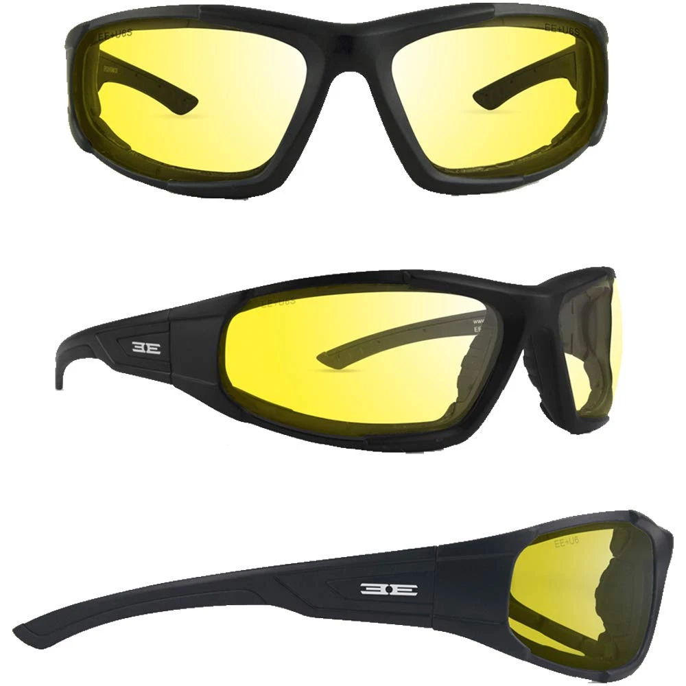 Description You are purchasing 3 pair of Epoch Foam Padded Motorcycle Sunglasses with Black Frames, 1 with Smoke Lens, 1 with Clear Lens, and 1 with Yellow Lens. The Epoch Foam 2 is a favorite foam performance glass. The frame is backed with vented foam to protect your eyes from any dust & debris that comes your way. The lenses are shatterproof polycarbonate. You'll never feel safer. These glasses feature foam that will seal and protect your eyes from dust, wind, and other irritants. If you're looking for motorcycle glasses that will keep you covered with 100% UVA & UVB protection and provide optimal visual clarity, then these are the ones for you. Smoke lenses are best for maintaining the true colors of what you're looking at. They block the most amount of light, which will help to reduce eyestrain if you'll be outside for an extended period of time. Yellow lenses are helpful in low-light conditions because they make an environment appear brighter. They also enhance contrast and depth perception and are great for overcast, hazy and foggy conditions. Epoch Eyewear is a Veteran owned and operated company. We are proud to be a part of the Veteran community and build a company that provides jobs and great products. Epoch Lifetime Warranty - Veteran Owned and Operated Company Shatterproof polycarbonate frame & lenses for maximum protection. Ultra-lightweight full frame with Vented EVA foam padding for extra comfort Meets or Exceeds ANSI Z87.1 Standards - Fit: Large - X-Large 100% UVA & UVB Protection Keeps Your Eyes Safe From the Sun.
