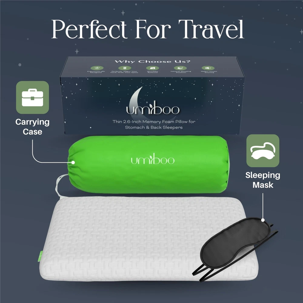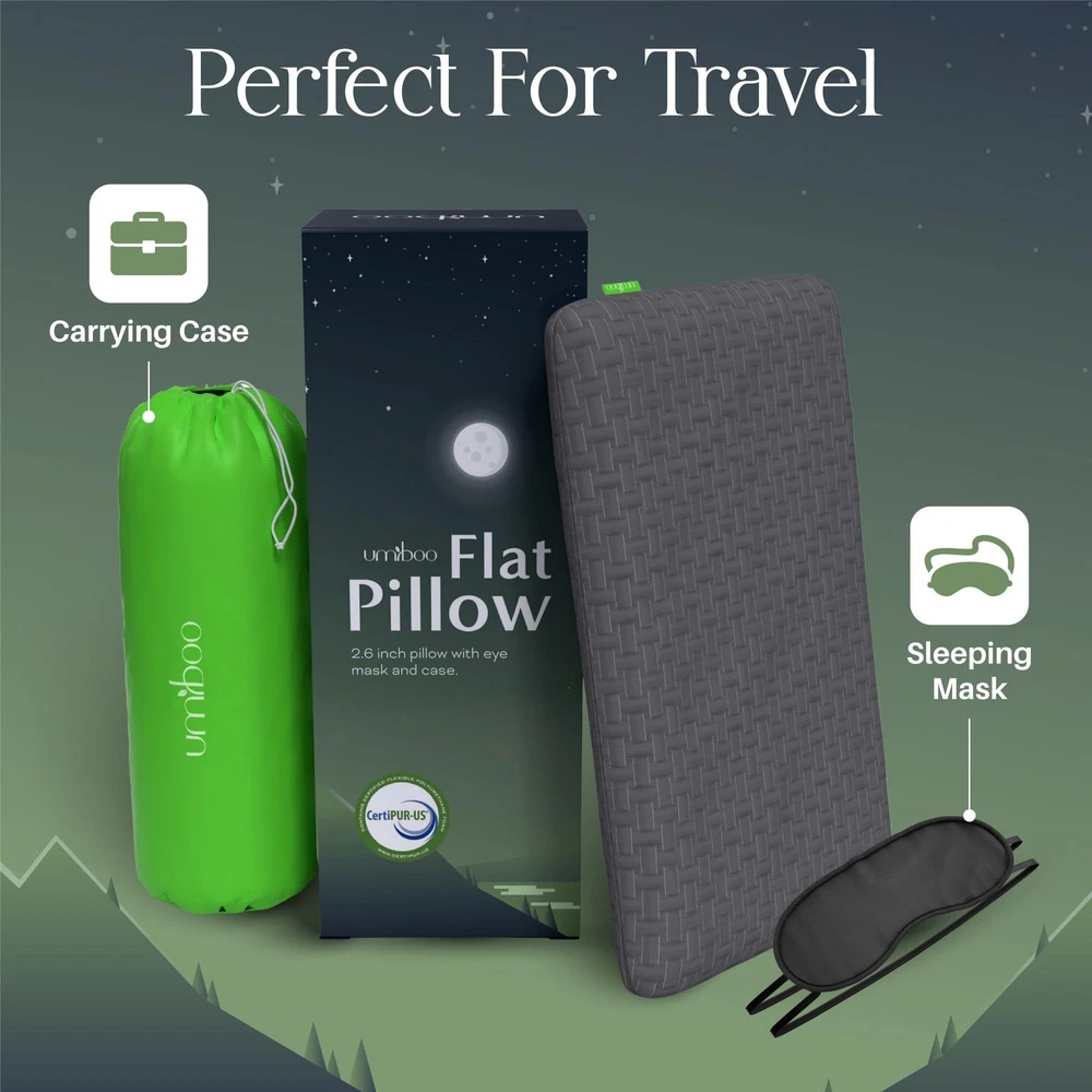 Two-Pack in White and Gray colors Gel-infused memory foam Medium-firm support Luxurious Bamboo/Rayon (30/70) cover Eye mask and travel case included 2.6 Height x 26 Length x 17 Width CertiPUR-US Certified Machine washable You've Tried it All!: Shredded Memory Foam, Down, and even Feather pillow, to no avail! Finally, meet 's new Gel-infused Foam 2.6" stomach sleeper pillows! It's time to upgrade your sleep experience with our new flat pillow Ultra-thin and firm flat pillow: Experience ultimate comfort with our flat and thin pillow, offering medium-firm support for stomach sleepers. Say goodbye to snoring and pain in your neck, shoulders, and back with this supportive memory foam pillow. You've Tried it All!: Shredded Memory Foam, Down, and even Feather pillow, to no avail! Finally, meet 's new Gel-infused Foam 2.6" stomach sleeper pillows! It's time to upgrade your sleep experience with our new flat pillow Sleep value bundle: You will receive one flat pillow, a luxurious Bamboo/Rayon cover, and a travel pillowcase for easy transport. As a special bonus, we've included an eye mask to help block out light and improve your sleep experience. Plus, our styl Hassle Free with Warranty! We take tremendous pride in our expert customer service record on Amazon, and we promise to treat you like family! Let our reviews speak for themselves! They are our most significant source of pride!